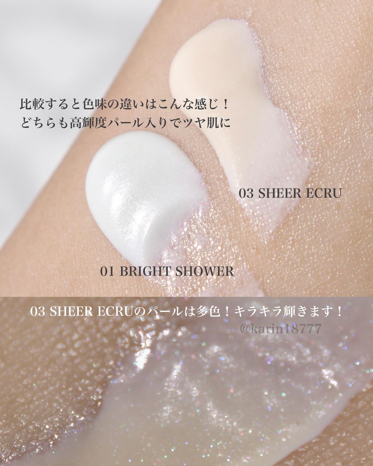 - <01 ブライトシャワー> マイカ、シリカ、酸化亜鉛、水、酸化チタン、BG、グリセリン、ジメチコン、ヒアルロン酸Na、キサンタンガム、香料、エタノール、炭酸ジカプリリル、トリエトキシカプリリルシラン、青1、ビスエチルヘキシルオキシフェノールメトキシフェニルトリアジン、イソヘキサデカン、EDTA-2Na、安息香酸アルキル(C12-15)、ポリソルベート80、PEG-400、オレイン酸ソルビタン、アルキル(C30-45)メチコン、オレフィン(C30-45)、(アクリル酸Na/アクリロイルジメチルタウリンNa)コポリマー、セバシン酸ジイソプロピル、エチルヘキシルトリアゾン、ポリシリコーン-9、(アクリレーツ/メタクリル酸ポリトリメチルシロキシ)コポリマー、ドロメトリゾールトリシロキサン、ポリアクリル酸アルキル(C10-30) <02 ローズチェア> マイカ、シリカ、酸化亜鉛、水、酸化チタン、BG、グリセリン、ジメチコン、ヒアルロン酸Na、キサンタンガム、香料、エタノール、炭酸ジカプリリル、トリエトキシカプリリルシラン、ビスエチルヘキシルオキシフェノールメトキシフェニルトリアジン、赤504、イソヘキサデカン、黄5、EDTA-2Na、安息香酸アルキル(C12-15)、ポリソルベート80、PEG-400、オレイン酸ソルビタン、アルキル(C30-45)メチコン、オレフィン(C30-45)、(アクリル酸Na/アクリロイルジメチルタウリンNa)コポリマー、セバシン酸ジイソプロピル、エチルヘキシルトリアゾン、ポリシリコーン-9、(アクリレーツ/メタクリル酸ポリトリメチルシロキシ)コポリマー、ドロメトリゾールトリシロキサン、ポリアクリル酸アルキル(C10-30) <03 シアーエクリュ> マイカ、シリカ、酸化亜鉛、水、酸化チタン、BG、グリセリン、ジメチコン、ヒアルロン酸Na、キサンタンガム、香料、エタノール、炭酸ジカプリリル、トリエトキシカプリリルシラン、ビスエチルヘキシルオキシフェノールメトキシフェニルトリアジン、赤504、イソヘキサデカン、黄5、EDTA-2Na、安息香酸アルキル(C12-15)、ポリソルベート80、PEG-400、オレイン酸ソルビタン、アルキル(C30-45)メチコン、オレフィン(C30-45)、(アクリル酸Na/アクリロイルジメチルタウリンNa)コポリマー、セバシン酸ジイソプロピル、エチルヘキシルトリアゾン、ポリシリコーン-9、(アクリレーツ/メタクリル酸ポリトリメチルシロキシ)コポリマー、ドロメトリゾールトリシロキサン、ポリアクリル酸アルキル(C10-30) <01 限定パッケージ> マイカ、シリカ、酸化亜鉛、水、酸化チタン、BG、グリセリン、ジメチコン、ヒアルロン酸Na、キサンタンガム、香料、エタノール、炭酸ジカプリリル、トリエトキシカプリリルシラン、青1、ビスエチルヘキシルオキシフェノールメトキシフェニルトリアジン、イソヘキサデカン、EDTA-2Na、安息香酸アルキル(C12-15)、ポリソルベート80、PEG-400、オレイン酸ソルビタン、アルキル(C30-45)メチコン、オレフィン(C30-45)、(アクリル酸Na/アクリロイルジメチルタウリンNa)コポリマー、セバシン酸ジイソプロピル、エチルヘキシルトリアゾン、ポリシリコーン-9、(アクリレーツ/メタクリル酸ポリトリメチルシロキシ)コポリマー、ドロメトリゾールトリシロキサン、ポリアクリル酸アルキル(C10-30) <04 さくらいろ(限定)> 成分情報無し