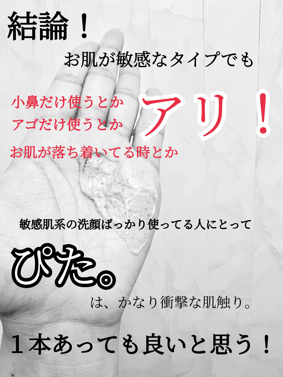 長年、敏感肌系の優しい洗顔料ばかりを使ってきた私には衝撃の肌触り…😳‼︎ ちなみに脂性肌の姉は単純に「良い」とのことで、肌質によって使い心地ってホントに違うんだな〜と思いました。 毛穴の黒ずみが消えたのと、炎症起こしてる部分にも滲みたりしないのは良かった◎(※通常は炎症など起きてる時は使ってはいけませんよ〜) 気になってるけどスクラブはちょっと…って思ってる人も、・小鼻などの部分使い・週2,3回などの使用はアリかと。 『1本あってもいいと思う』ってレベルにはオススメ出来ます🙏