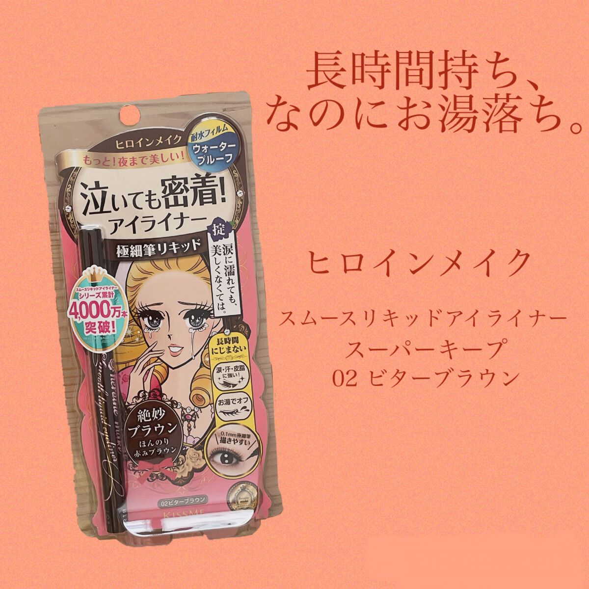 ヒロインメイクスムースリキッドアイライナースーパーキープ02ビターブラウン耐久性の高い処方でウォータープルーフで涙・汗・皮脂に強く美しいラインを長時間キープお湯オフというから買ってみたぁ細筆で描きやすい抜け感があるのでブラウン系、好きまぁまぁ...