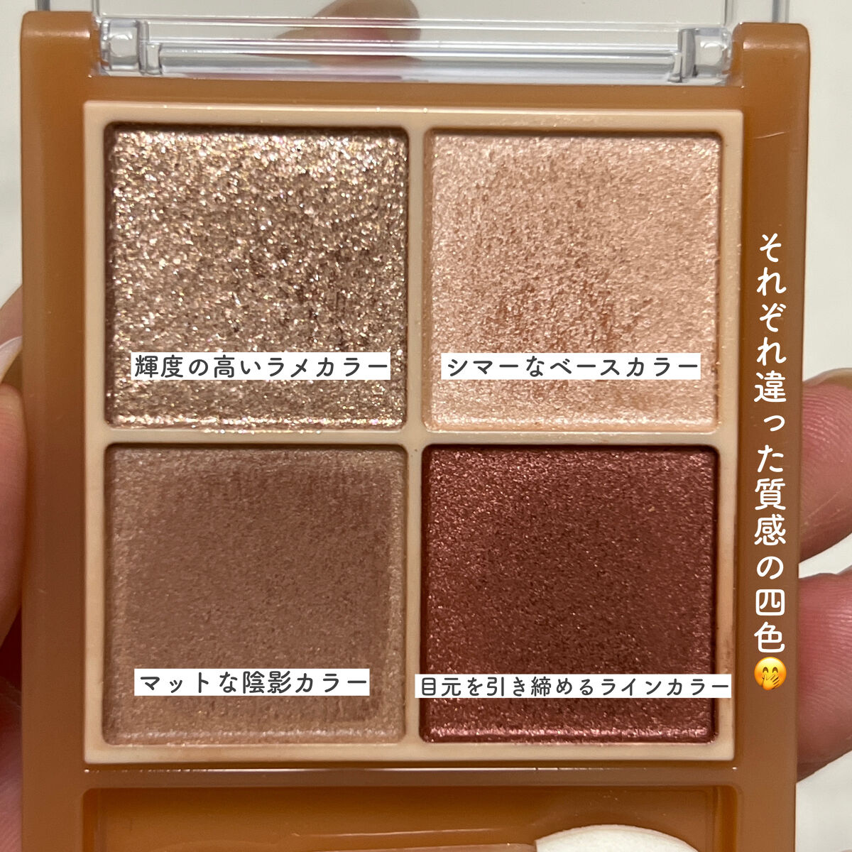 - ラメ・パール・マット3質感の4色アイシャドウ。 肌馴染みの良いベージュを基調としたカラー。ラメ・パール・マットの3質感を重ねて、自然にまぶたを強調し奥行のある大きな目元へ。 しっとり溶け込むような柔らかなパウダーなので、スルスル伸びてまぶたにピタッと密着。保湿成分(スクワラン・ホホバ種子油)配合。