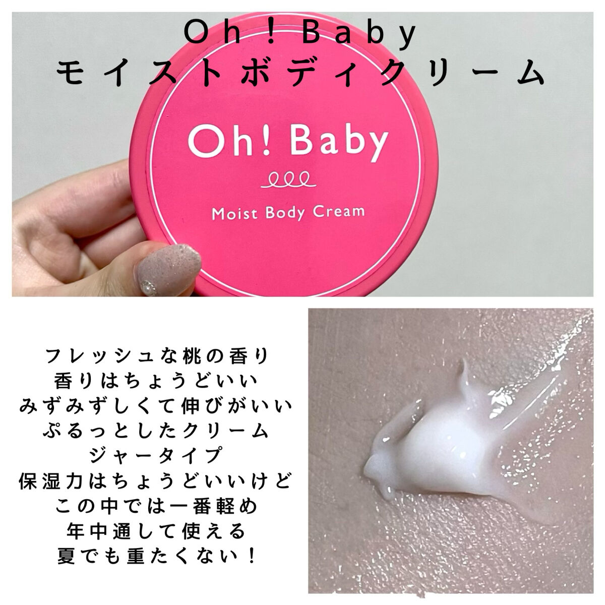 ほんっっっとに桃のいい香り!! Oh!Baby モイストボディクリームはジェルっぽいジュワッと肌に溶け込むテクスチャーかつフレッシュな桃の香りを纏えるのでお風呂上がりに毎日揉み込んでいます☺️ いい意味でこっくりしておらず瑞々しい質感なので必要な水分を補ってくれてぷるんぷるんの肌に慣れました。