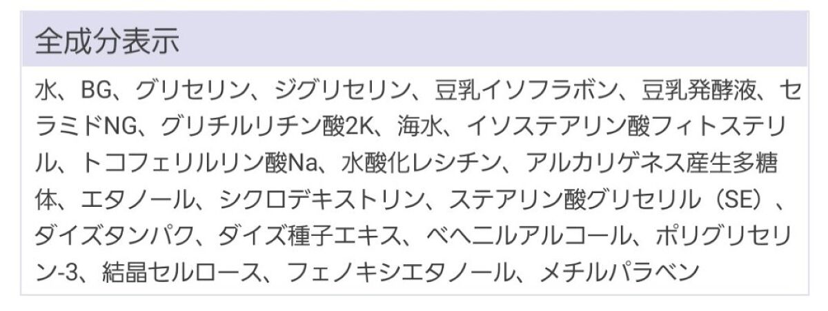 - <100ml> 水、ベヘニルアルコール、BG、グリセリン、ジグリセリン、フェノキシエタノール、メチルパラベン、エタノール、グリチルリチン酸2K、セラミドNG、ダイズ種子エキス、シクロデキストリン、ステアリン酸グリセリル(SE)、海水、トコフェリルリン酸Na、豆乳発酵液、アルカリゲネス産生多糖体、結晶セルロース、水酸化レシチン、ダイズタンパク、イソステアリン酸フィトステリル、豆乳イソフラボン、ポリグリセリン-3