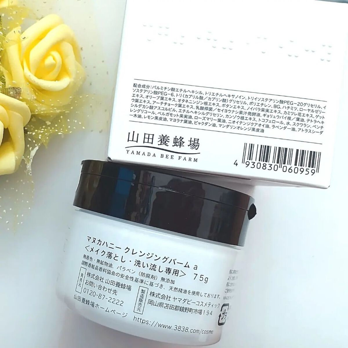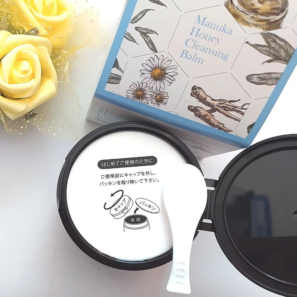 マヌカハニークレンジングバーム🍯.付属のスパチュラでバームを肌にのせて、肌温にとろりととろけるバームは、メイクの上でくるくるするとスルスルメイクと馴染む❤︎.マヌカハニーのおかげか、私は洗い上がりのしっとり感が感じられて満足🫶.抗菌成分を含む...