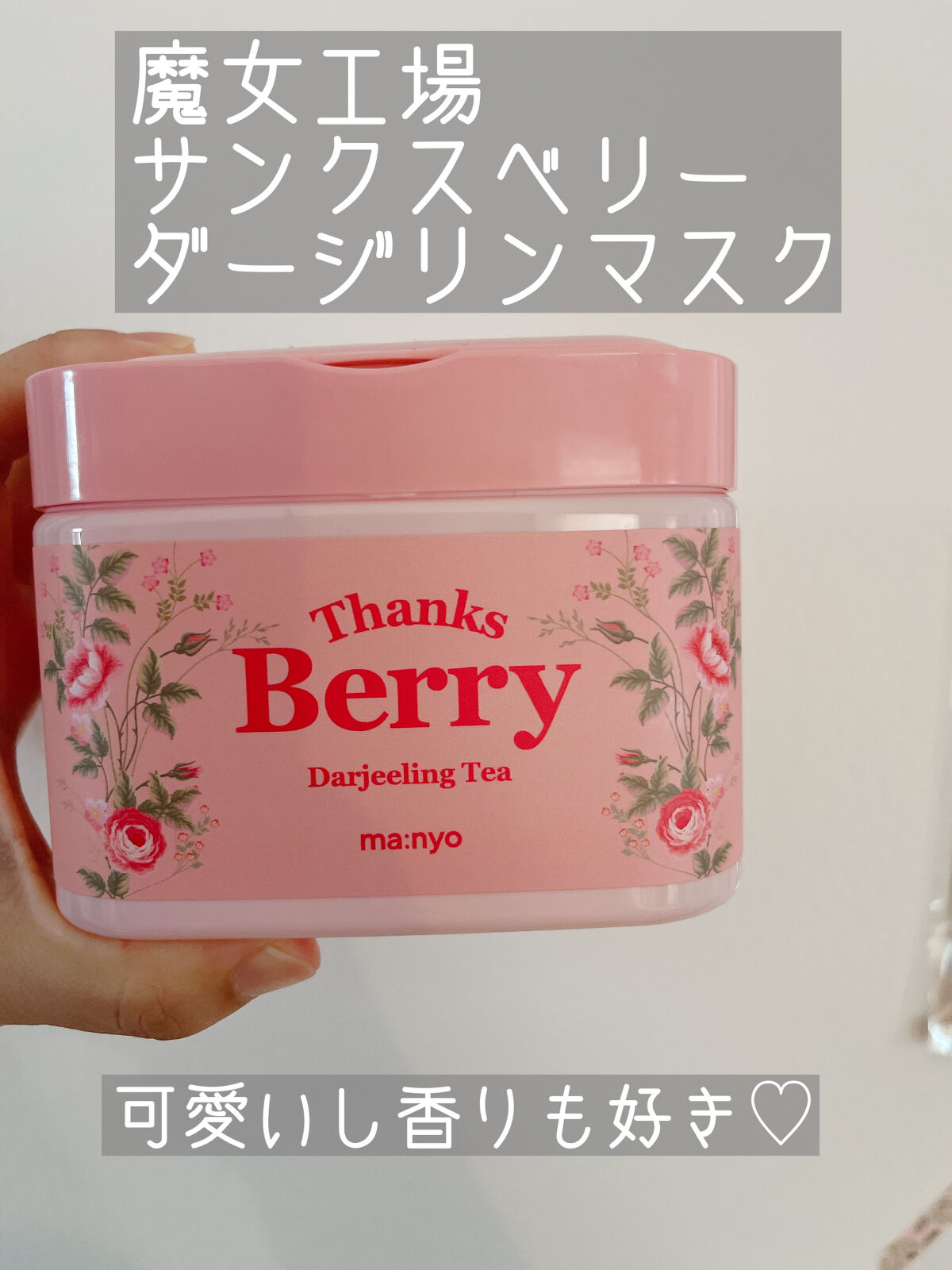 manyoThanksBerryダージリンティーマスクケーキが入っているみたいな箱に入っているマスクで見た目が可愛い😍🎂ラズベリーストロベリーブルーベリークランベリーアサイーベリー5種類のビタミンが豊富に含まれているみたいです✨シートはペラペ...