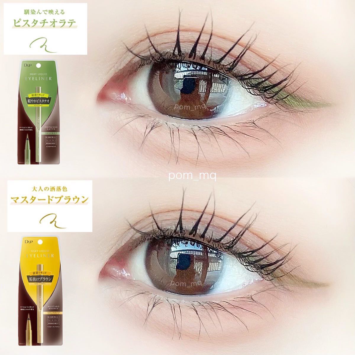 - 筆先までずっとなめらか、目尻で感動するリキッドアイライナー。 必要な量が肌にのる新設計で、まぶたの上をすべるような、滑らかな描き心地。しなやかでコシのある筆が、筆圧のコントロールを容易にし、太いラインも細いラインも思い通りに仕上げます。水、汗、涙に強いウォータープルーフタイプなのに、通常洗顔で簡単オフ。肌に色素が残らない顔料を使用。5種類の美容液成分を従来品の200%配合し、メイクしながら目元ケアまで。 ●ブラウンブラック ※2020年9月12日 バラエティショップ先行発売 ●漆黒ブラック ※2020年12月頃発売予定 ●ナチュラルブラウン ※2020年12月頃発売予定 ●シフォンブラウン 「毎日メイクに透明感と抜け感」 ブラウンでも、グレーでも、ベージュでもないニュアンスカラー。 自然な印影で素の目元を際立て、頑張りすぎない、ふんわりとした目元に。 ●アプリコットブラウン 「じゅわっと血色感。 肌に馴染むおしゃれカラー」 温かみのあるアプリコットがじゅわっと滲む血色感を目元に演出。 肌馴染みが良いので、カラーライナーに抵抗がある方もブラウンの延長線上で楽しめる、使いやすい色味です。 ”ちょっとオシャレ”な空気感を演出するカラー。 ●ピンクショコラ アイライナー 「ピンクが溶け込む濃厚ブラウン」 肌馴染みが良く、目元にじんわり血色感をプラス。 さりげなく女性らしさが加速するようなカラー。 ●ピスタチオラテ (2022年7月29日(金)発売) 「“目尻”に抜け感アクセント」 肌に馴染むのに映える絶妙なグリーン。 トレンドカラーに“くすみ”と“抜け感”をプラスしたまろやかな発色。 ●マスタードブラウン 「“イエロー”が揺れる、大人の洒落色」 (2022年7月29日(金)発売) まるで太陽のような暖かさを感じる新しいブラウン。 ほんのり感じるイエローでメイクが一気に垢抜ける稀有な色。 ●シフォンピンク(2023年2月10日発売) 「ふんわり柔らか"まろみピンク"」 甘くなりすぎない青みニュアンスで目元の透明感UP。 目元を引き締め、ピンクメイクにありがちな腫れぼったさを解消。 ●ミルクカプチーノ(2023年4月21日発売) まろやかな深みの“優しい締め色” どんなメイクにも合わせやすいカラー。 自然な陰影でさりげなく目幅を拡張します。 ●グレーカシミア(2023年10月1日発売) ブラウンがほんのり溶け込んだ、暖色グレー まろやかな発色で、パーソナルカラーを問わず肌に馴染む 目元の陰影になりすまし、抜け感と目力を欲張りに叶える ●ダークフィグ(2024年6月1日発売) するする”なめらか。描きやすいのに、落ちにくい。 クッキリ可愛いほの甘ダークブラウン ●ピーチモカ(2024年8月1日発売) ふわっと自然に盛れる“桃色ブラウン” ほんのり血色感で目元にうるみ感を演出 ●スターダストブラウン(2024年12月11日発売) キラッと繊細に輝く''星屑ブラウン'' 透け感のあるダークブラウンの色味とラメの輝きが、目元に艶のある立体感を演出 ●チャコールモカ(2025年4月10日発売) 目元を締める''深みグレージュ'' 黄みや赤みに偏りすぎない絶妙な色設計で、自然に目元を強調