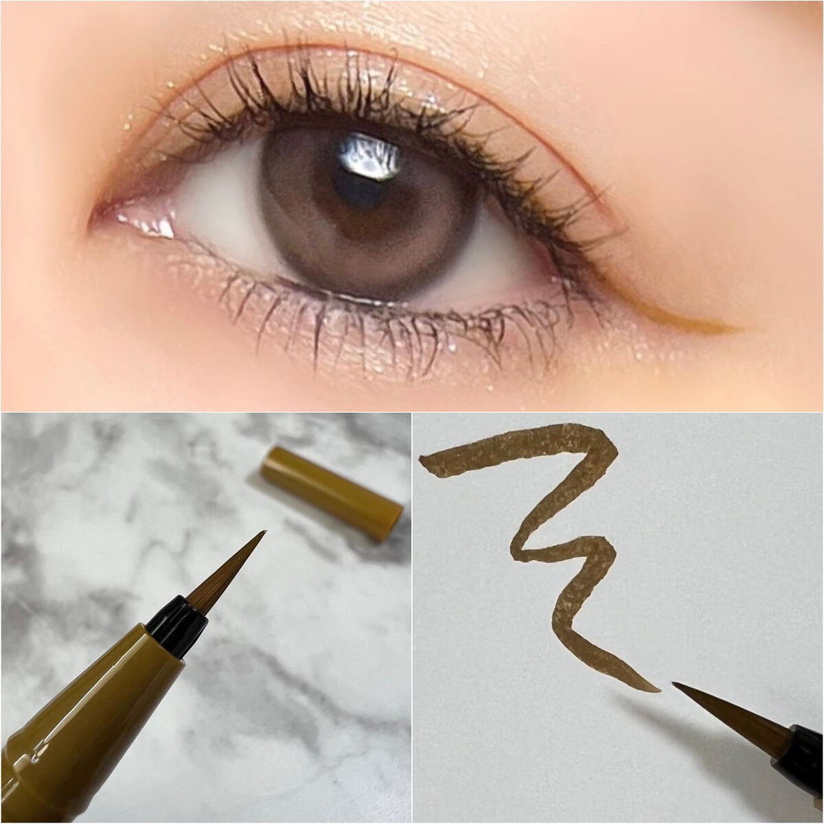 透け感あるブラウンに、シルバーと青の繊細なラメがたっぷり⟡.· 目元に馴染むブラウンで使いやすいし、キラキラアイライナー可愛すぎる🥹✨ コシがある筆で描きやすくて好き♡ 今回はラメ含みの良い専用筆とのことで筆先もキラッキラ🪩 全国のバラエティショップとドラッグストアでぜひチェックしてみてね✰
