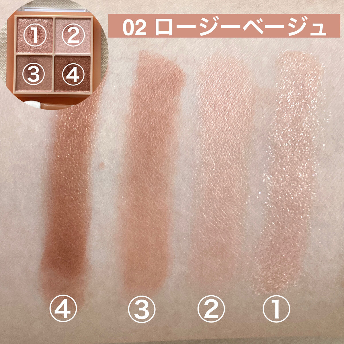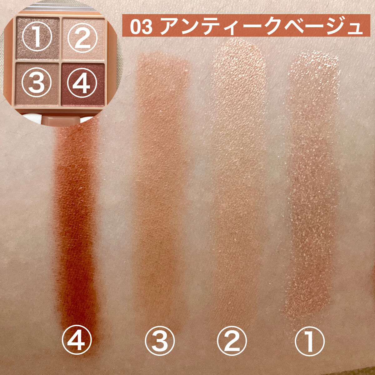 - ラメ・パール・マット3質感の4色アイシャドウ。 肌馴染みの良いベージュを基調としたカラー。ラメ・パール・マットの3質感を重ねて、自然にまぶたを強調し奥行のある大きな目元へ。 しっとり溶け込むような柔らかなパウダーなので、スルスル伸びてまぶたにピタッと密着。保湿成分(スクワラン・ホホバ種子油)配合。