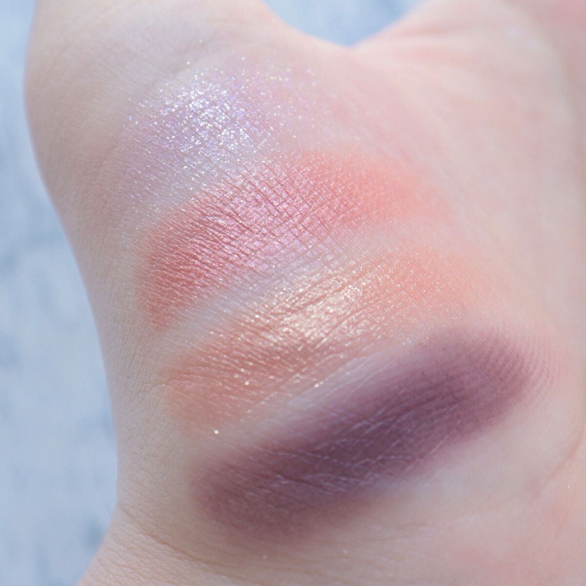 シマー、プリズム、マットそれぞれの質感でツヤと立体感を演出してくれるアイシャドウ✨ ツヤツヤ綺麗な青みピンク。シルバーとピンクのラメが綺麗なグリッター。ほんのりグレーがかったブラウン。ほんのり赤みを感じるツヤツヤモーヴブラウン。この組み合わせが絶妙すぎる🥹❤️❤️ 濃くないのにしっかり目元に印影が出て彫りが深く見えてめちゃくちゃ盛れる!!メイクしながら声が出たくらい盛れる!!! しっとりした粉質で粉飛びせずひと塗りでしっかり色が乗ってくれてお値段以上の質の良さで最高だった🫶🏻