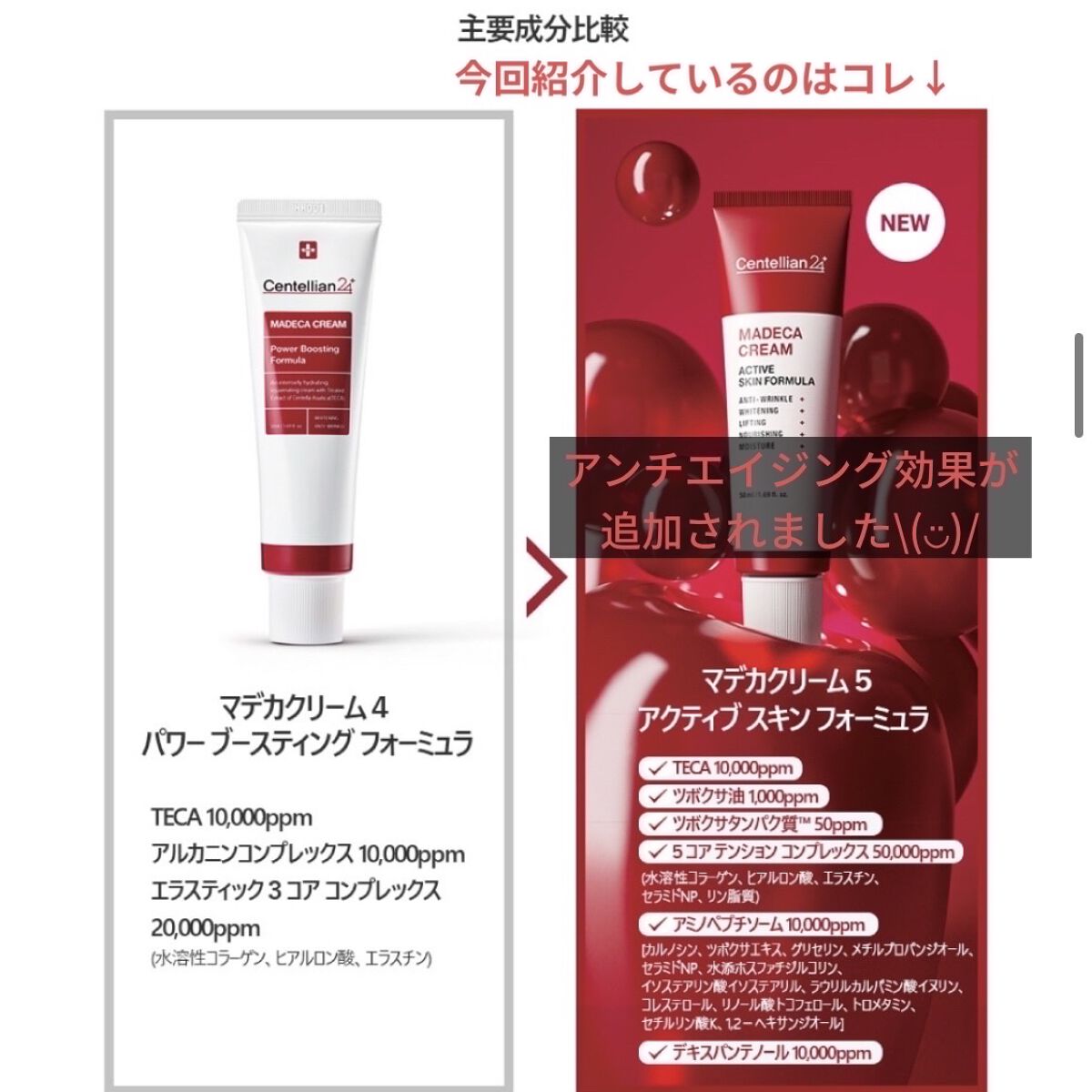 マデカクリーム タイムリバース(シーズン7) ✔︎シーズン6をパワーアップさせたシーズン7 ✔︎12のツボクサ+TECA *1 ✔︎コラーゲン、エラスチン、ヒアルロン酸 ✔︎鎮静、保湿、美白、シワ改善に✨ エキスパートマデカクリームRADIANCE ✔︎ TECA*1をベースにビタミンC,D,Eやサジーの実エキスを配合 ✔︎肌に不足している水分を与え、バリア機能強化をサポート ✔︎乾燥によるシミやくすみにアプローチ アフリカ・マダガスカル島で採取したツボクサの中に含まれるセンテラアジアチカを、ドイツのマーチンバウアー社の250以上もの厳格な過程を経て厳選し、東国製薬皮膚科学研究所の7段階にわたる独自工程を経て抽出した成分