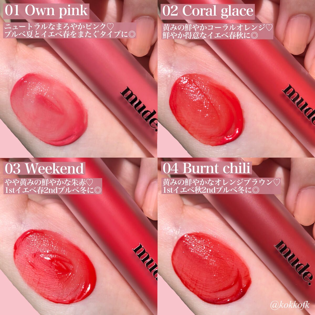 既存のジューシーラスティングティントよりさらに軽いツヤ感が魅力の新作ティント! 色選びの参考にしてね! やや黄みの明るいオレンジコーラル鮮やか得意なイエベ春におすすめ! 黄みの明るくまろやかなオレンジベージュ黄みが得意なイエベ春におすすめ! 青み黄み中間なくすみピンクベージュブルベ夏やイエベ春におすすめ 黄みの深くて鮮やかなオレンジレッド鮮やか得意なイエベ秋におすすめ! 青みの鮮やかで明るいビビッドピンク明るさ得意なブルベ冬やブルベ夏におすすめ! 青みの明るめで柔らかいローズピンクブルベ夏やブルベ冬におすすめ! 青み黄み中間な鮮やかで強いビビッドレッド2ndイエベ春のブルベ冬におすすめ! 青みの強い深くて鮮やかなベリーレッド2nd夏で鮮やか得意なブルベ冬におすすめ!