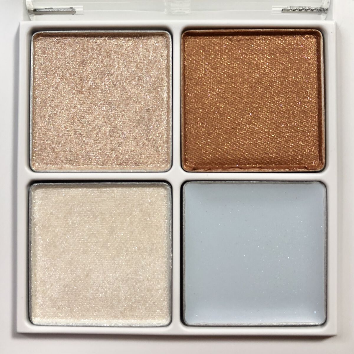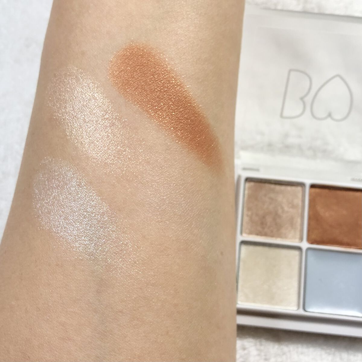 全体的には、名前のとおりヌーディーな印象☺️定番色「01 本命のブラウン」と似てるんだけど、今回の「104 本能のヌードベージュ」の方が、よりヌーディーなカラーとなっておりまする💁🏻♀️ 左上のベージュカラー(1番)は、基本的にはマットカラーなんだけど、ほんのりラメも入ってるから、のっぺりとした印象にならなくて良き🥰 4番のカラーは、ハイライトとして使うこともできるし、個人的には涙袋に使っても良いのではないかと思っておりまする👻 こちらは、全体的にしっとりとしたテクスチャーとなっておりまする💖そして、上2色のマットカラーが、結構しっかり発色してくれます❣️ 右下のハイライトカラーも、「104 本能のヌードベージュ」ほど白っぽくならないので、さりげなくハイライトを入れたい人にピッタリ✨