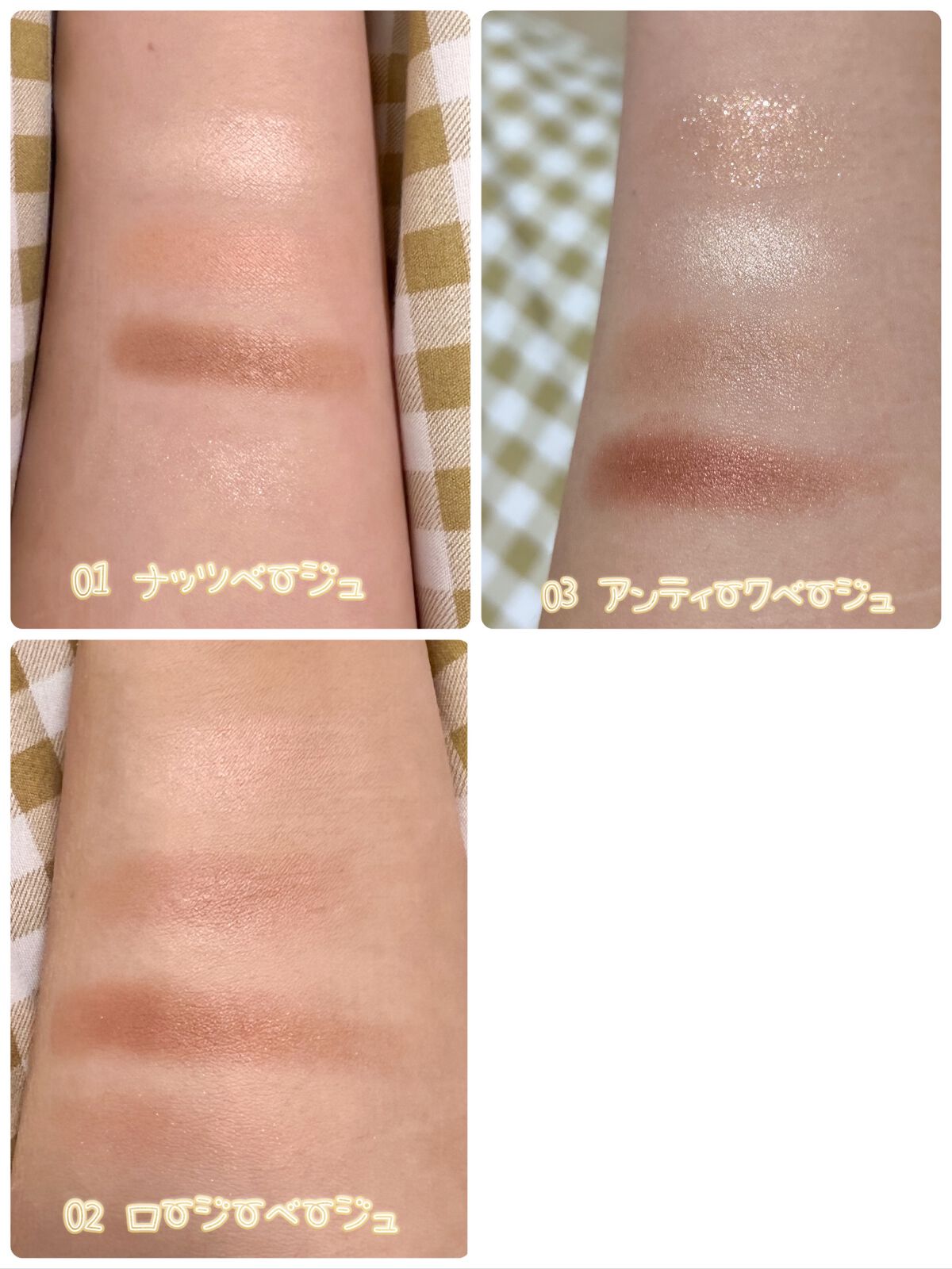 - ラメ・パール・マット3質感の4色アイシャドウ。 肌馴染みの良いベージュを基調としたカラー。ラメ・パール・マットの3質感を重ねて、自然にまぶたを強調し奥行のある大きな目元へ。 しっとり溶け込むような柔らかなパウダーなので、スルスル伸びてまぶたにピタッと密着。保湿成分(スクワラン・ホホバ種子油)配合。