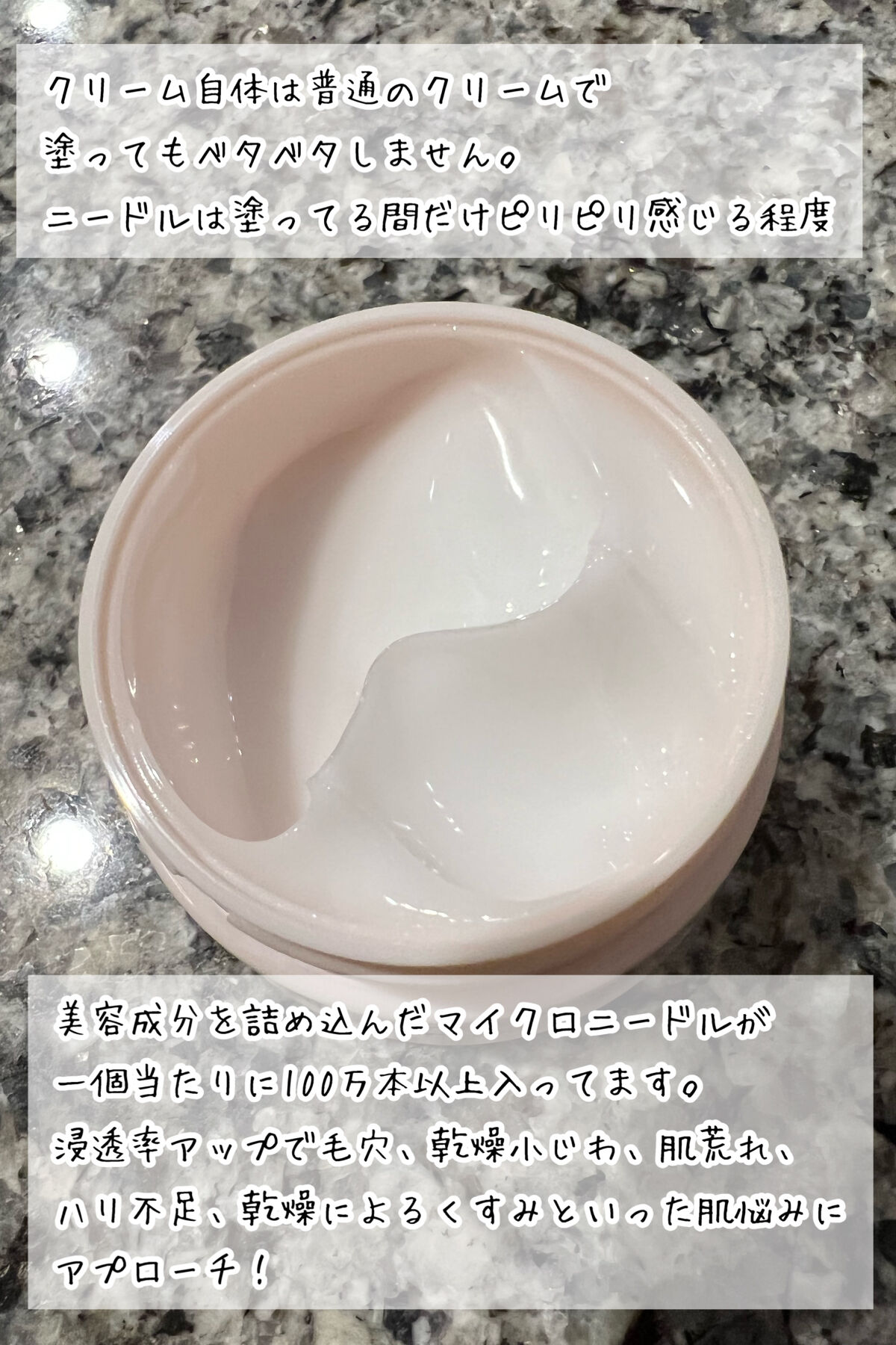 マイクロニードルを1個当たり約100万本以上配合した、フェイスクリーム🤍 ニードルにはなんと純金24Kを纏わせているとのこと😮 5つの美容成分が ・毛穴 ・乾燥による小じわ ・肌あれ ・ハリ不足 ・乾燥によるくすみなどの悩みにアプローチ💥 使い続けると肌がピンとする感じがして、 使い切ったのでまたリピートしたいです🫶