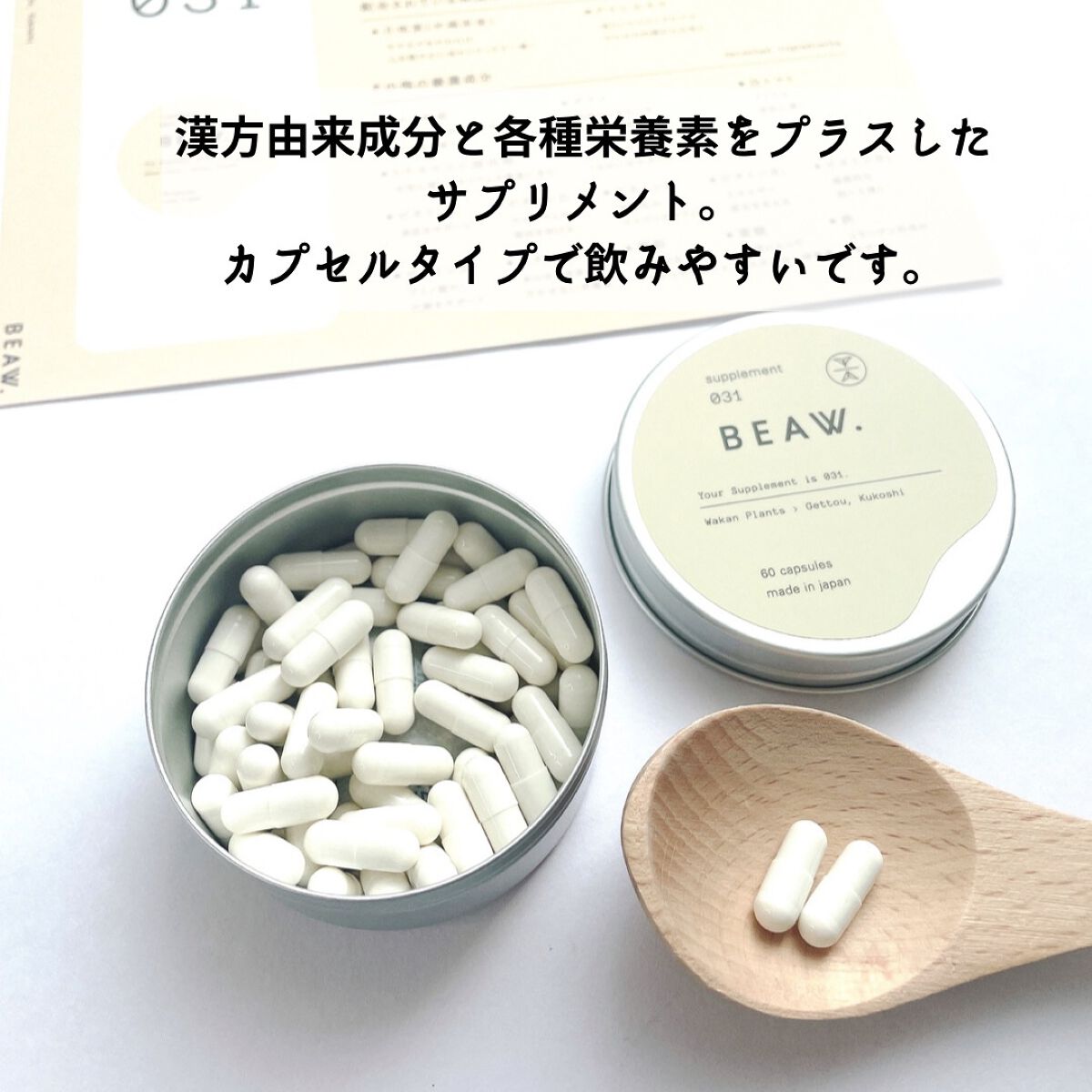 - ・BEAW.のパーソナライズケアは始めにパーソナライズ診断を行い、20種類の和漢と、自然由来の保湿成分の組み合わせから、一人ひとりに合わせた製品をお届けします。 ・現在の自分の悩みにぴったりのパーソナルケアキット、和漢植物由来成分を配合した2剤式のセラムとサプリメントのセットでお届けします。からだの内と外から同時に理想の美しさをめざせるデュアルケアで、あなたの美容をサポートします。 ・美容液は、肌荒れ予防、乾燥、毛穴、テカリ、くすみ*、年齢肌、ツヤ肌、などその人それぞれの悩みに対して適した処方で国産和漢植物成分と、植物エキス、ビタミンやセラミド、プラセンタ、ナイアシンアミド、などを配合した保湿成分を分析結果に合わせて配合。*乾燥による ・サプリメントは体の内側からキレイをサポートする国産和漢植物成分と20種類以上のビタミン、ミネラルをそれぞれに合わせて配合。 -対象商品- BEAW.リッチセラム003、008、015 BEAW.サプリメント:001、007、031 BEAW.フェイスウォッシュ:019、026、045 -内容量- BEAW.リッチセラム:30ml BEAW.サプリメント:60粒 BEAW.フェイスウォッシュ:80g