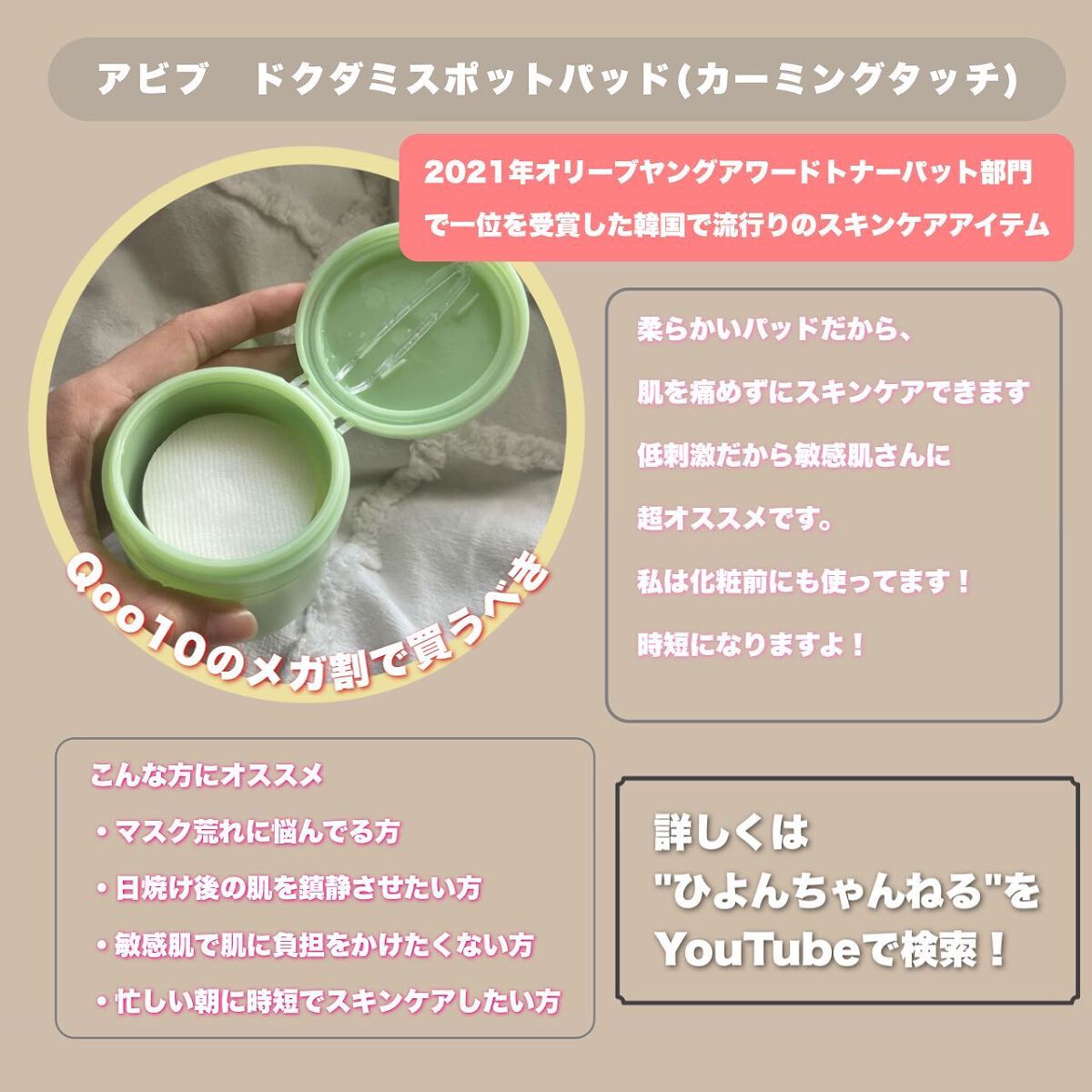 Abibドクダミスポットパッドカーミングタッチドクダミエキスを中心にヒアルロン酸Na、アラントイン、トレハロースなど保湿・鎮静成分を配合◎敏感に傾いた肌を土台から整えてくれる人気のトナーパッドです。洗顔後、ピンセットでパッドを取り出しガーゼ面...