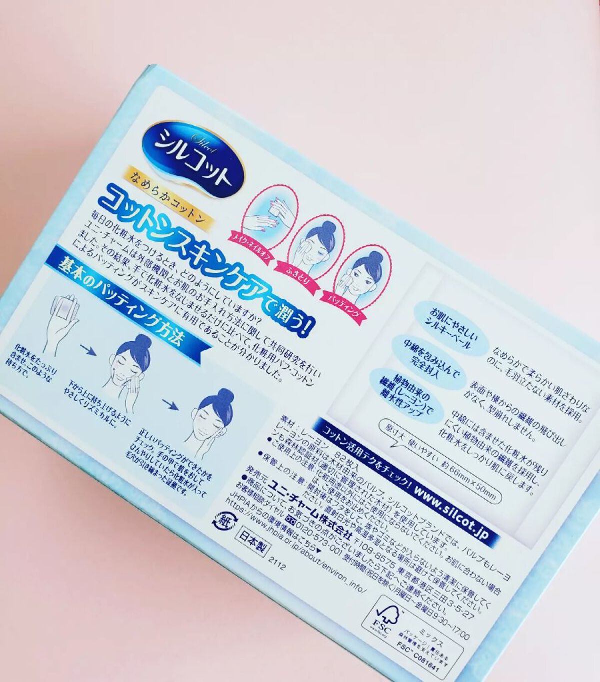 植物由来の繊維(レーヨン)で離水性アップ。中綿に含ませた化粧水が残りにくい繊維を採用し、化粧水をしっかり肌に戻します。 中綿を包み込んで完全封入。表面や横からの繊維飛び出しがなく、型崩れしません。