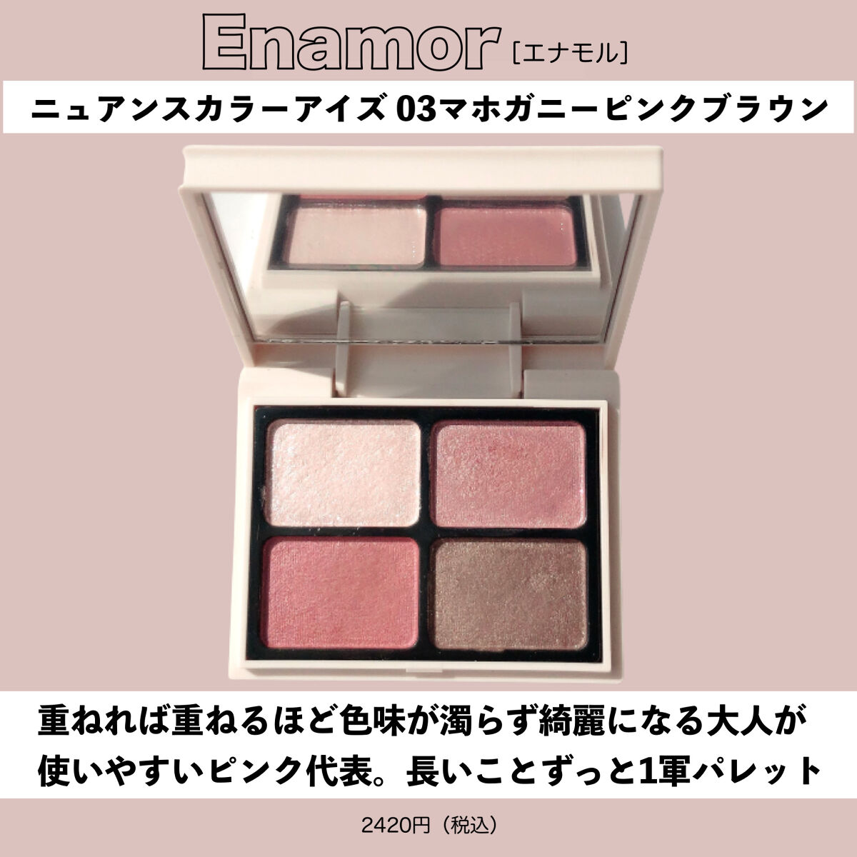 イエベ秋におすすめ上品デパコスパレット6選穏やかな色味で派手にならずオフィスメイクにも◎スックシグニチャーカラーアイズ04▶︎落ち着いた甘さの大人ピンクパレット右上マットピンクでくすみ具合を調整できます右下は青みがあるので苦手な方はポイント的...