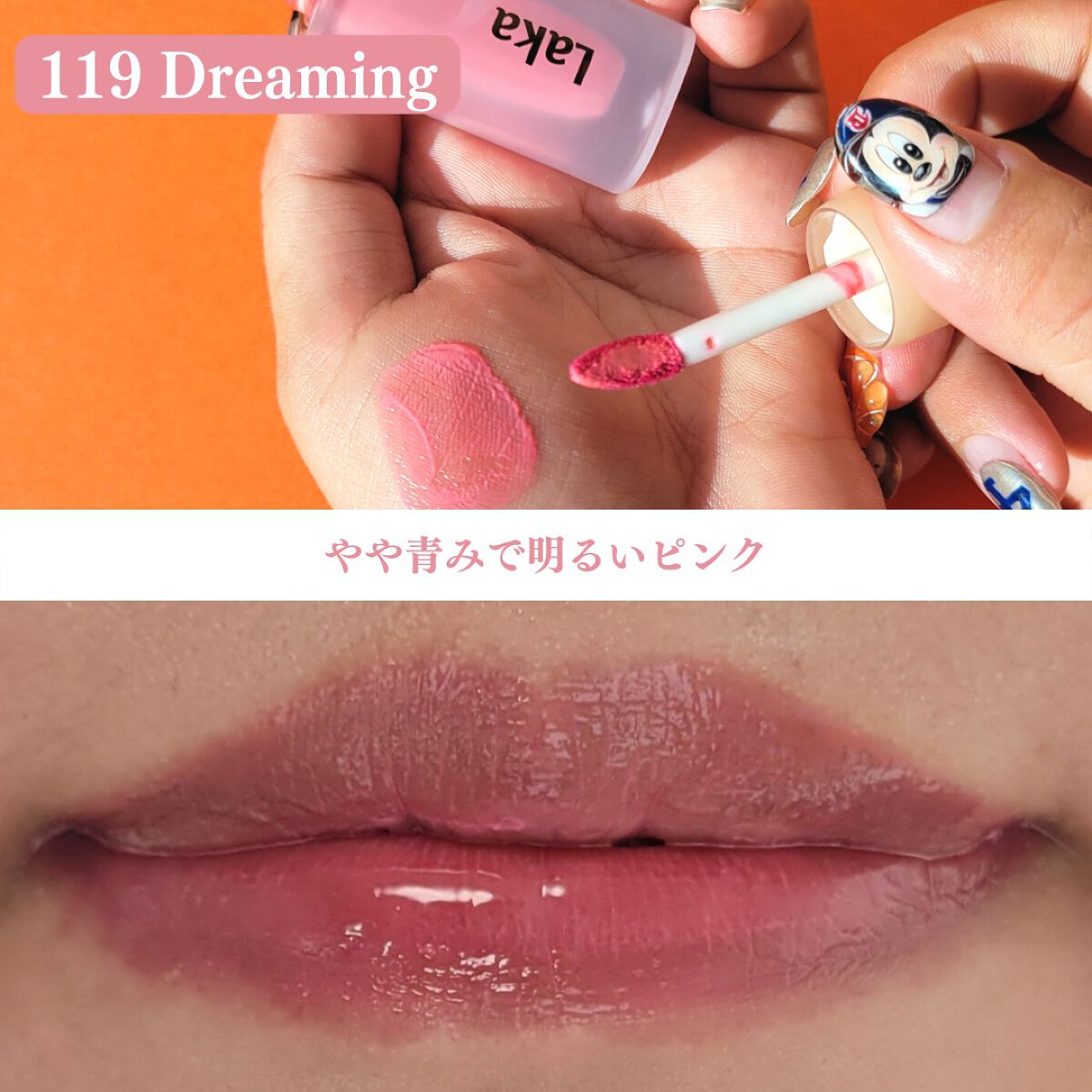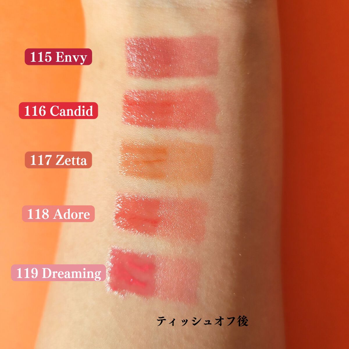 LAKA フルーティーグラムティント うるうるちゅるちゅるリップ♡ 前回の新色は全体的に明るめの色が多くて 今回は深みのある色も追加✨こんな色待ってたよ〜! 115 Envy 間違いなく今回イチオシの色。(超個人的) 青みで深いプラム系のレッドで 116 Candid こちらはニュートラル気味だけど若干青みの 鮮やかなレッド。これもかんわいい🥹 117 Zetta こちらは新色の中で1番黄味の強い色。 黄みのオレンジブラウンで明度と彩度も絶妙。 118 Adore なにこれアニメに出てくるヒロイン…? やや黄み寄りの明るいピンクでイチオシ 119 Dreaming やや青みの白みピンク!うわあかわいい〜! ぴゅあぴゅあなお口すぎてもう赤ちゃんかよ。