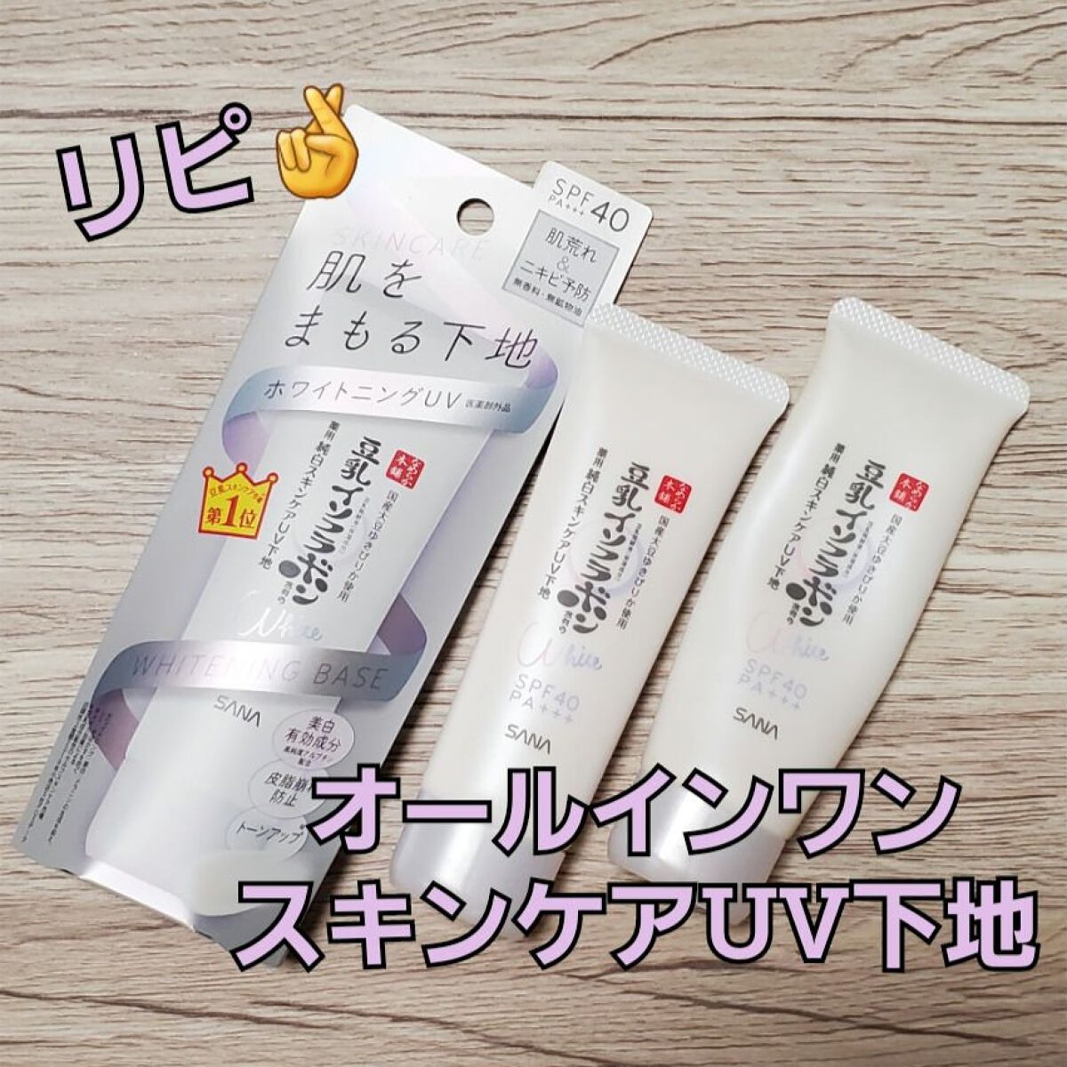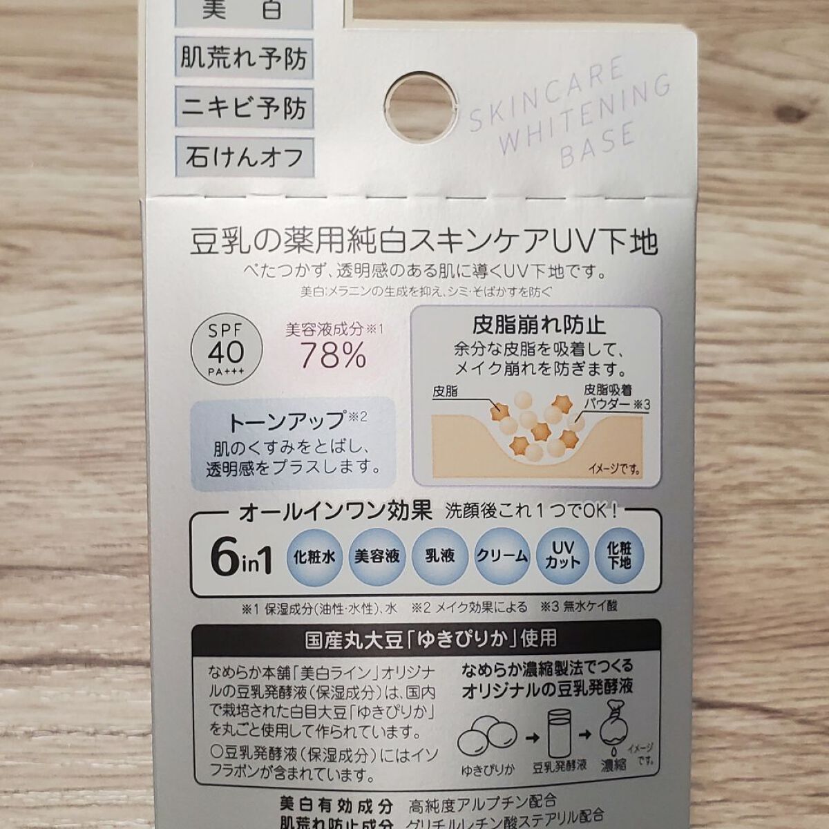 - <薬用美白スキンケアUV下地> 豆乳の美白スキンケアUV下地。肌荒れ&ニキビ予防しながら美白!メラニンの生成を抑え、シミ・そばかすを防ぎます。トーンアップ(メイク効果による)&皮脂崩れ防止。化粧水・美容液・乳液・クリーム・UVカット・化粧下地の1本6役。SPF40・PA+++。[販売名:サナ なめらか本舗 薬用美白スキンケアUV下地]