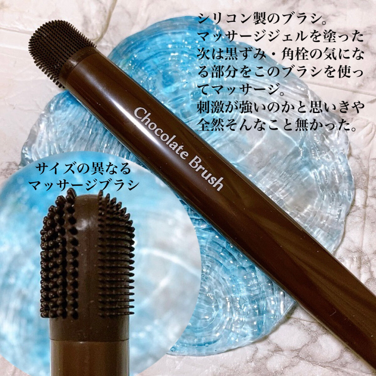 マッサージブラシで気になる箇所を優しくくるくると洗います。 マッサージブラシはシリコンのようなブラシで、片面は細かく、もう片面は少し大きめな見た目だなと思います🎶 洗い流すとすっきりとし、毛穴の汚れもちているように感じました✨ 美容液は少し白みがかったとろみのあるテクスチャーです。 肌に伸ばすとスルスルと気持ちよく伸びてくれて伸びが良く、柑橘系の香りも心地よいです😁 肌馴染みも良く、スーッと馴染んでいってくれるように感じます。