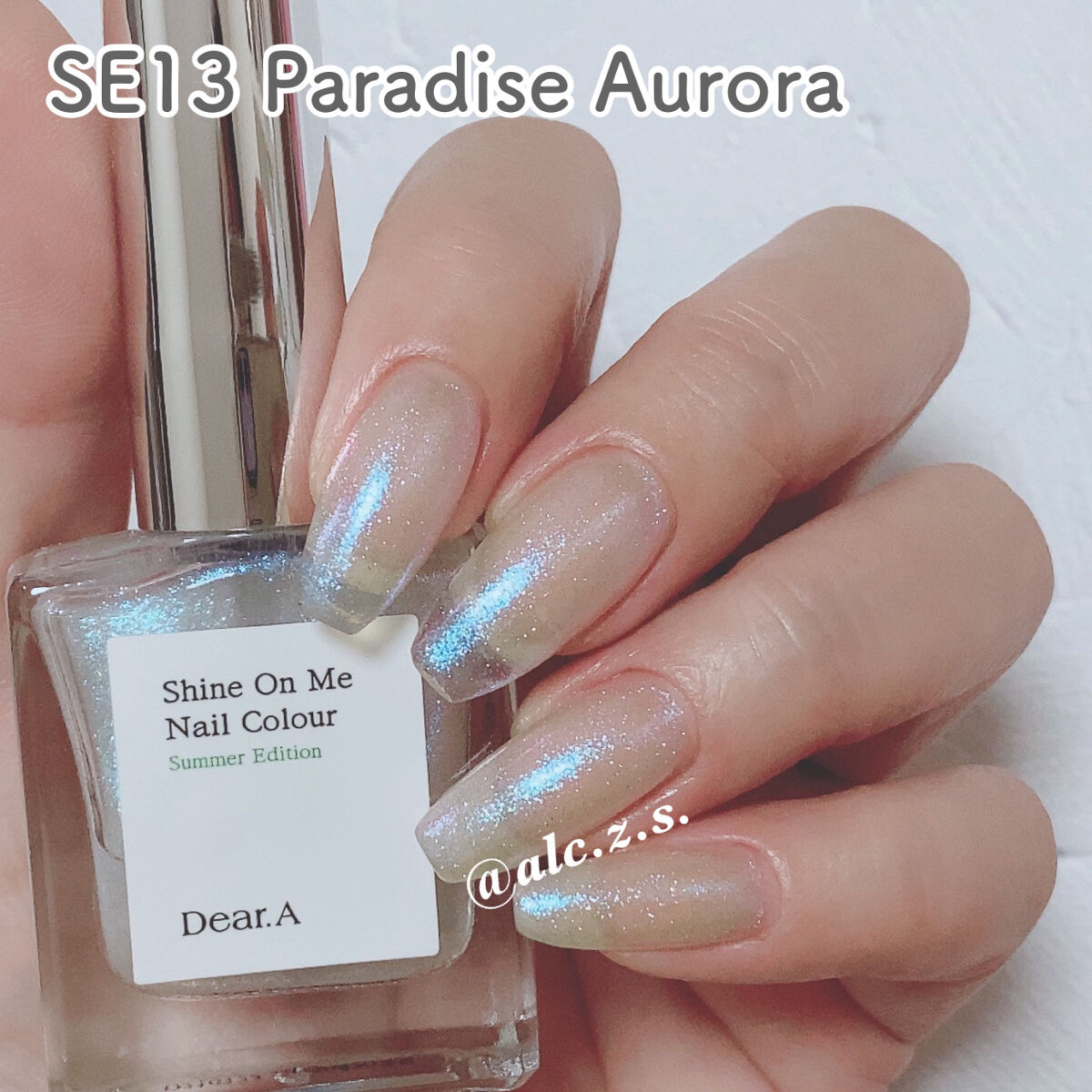 Dear.AさまからいただきましたDear.AシャインオンミーネイルカラーSE31SE32透け感のある発色一度塗りだと色むらになりやすいコツはたっぷりめに塗ること!クリアブルーシルバーラメトップコートがわりにも使えそうサラッとしたテクスチャー...