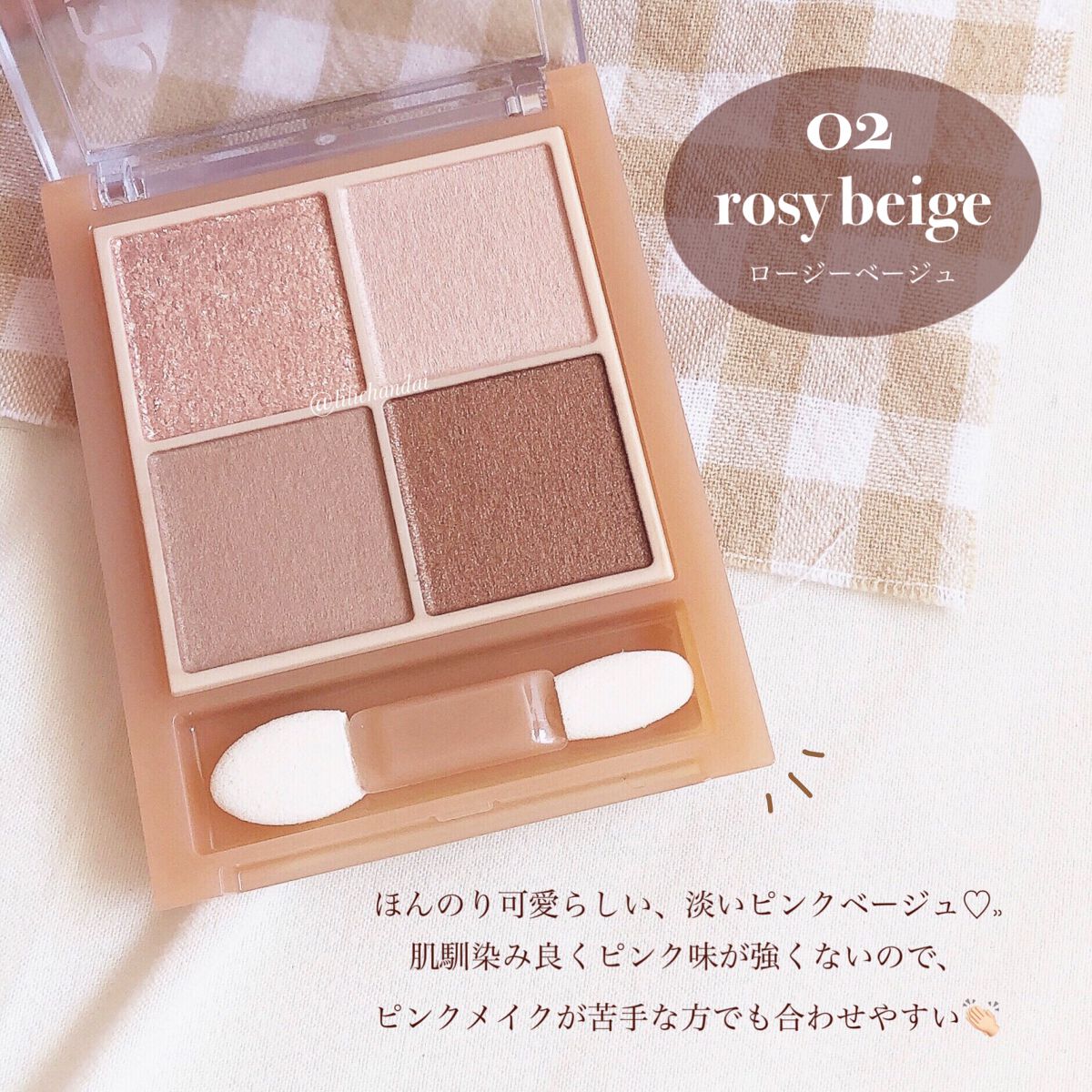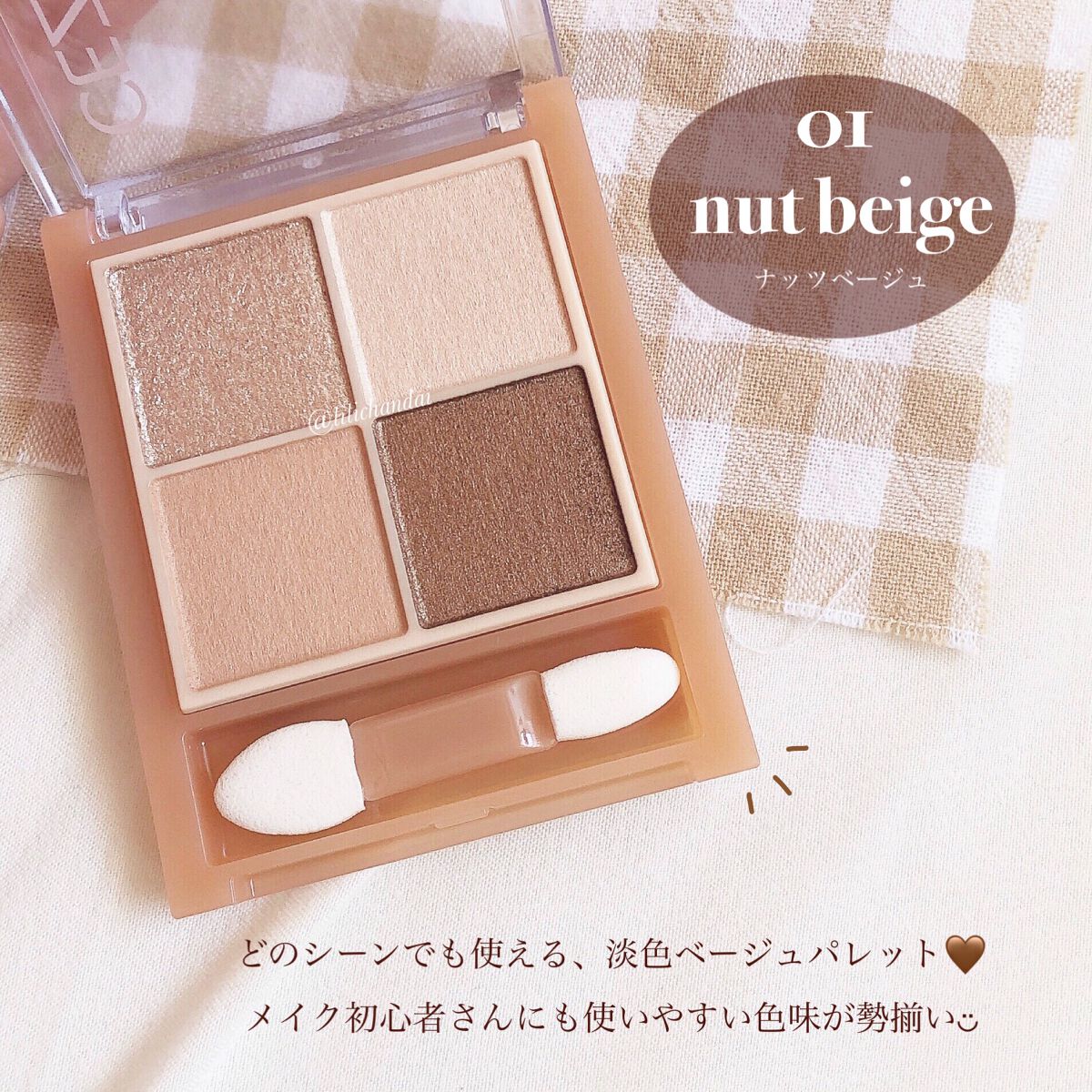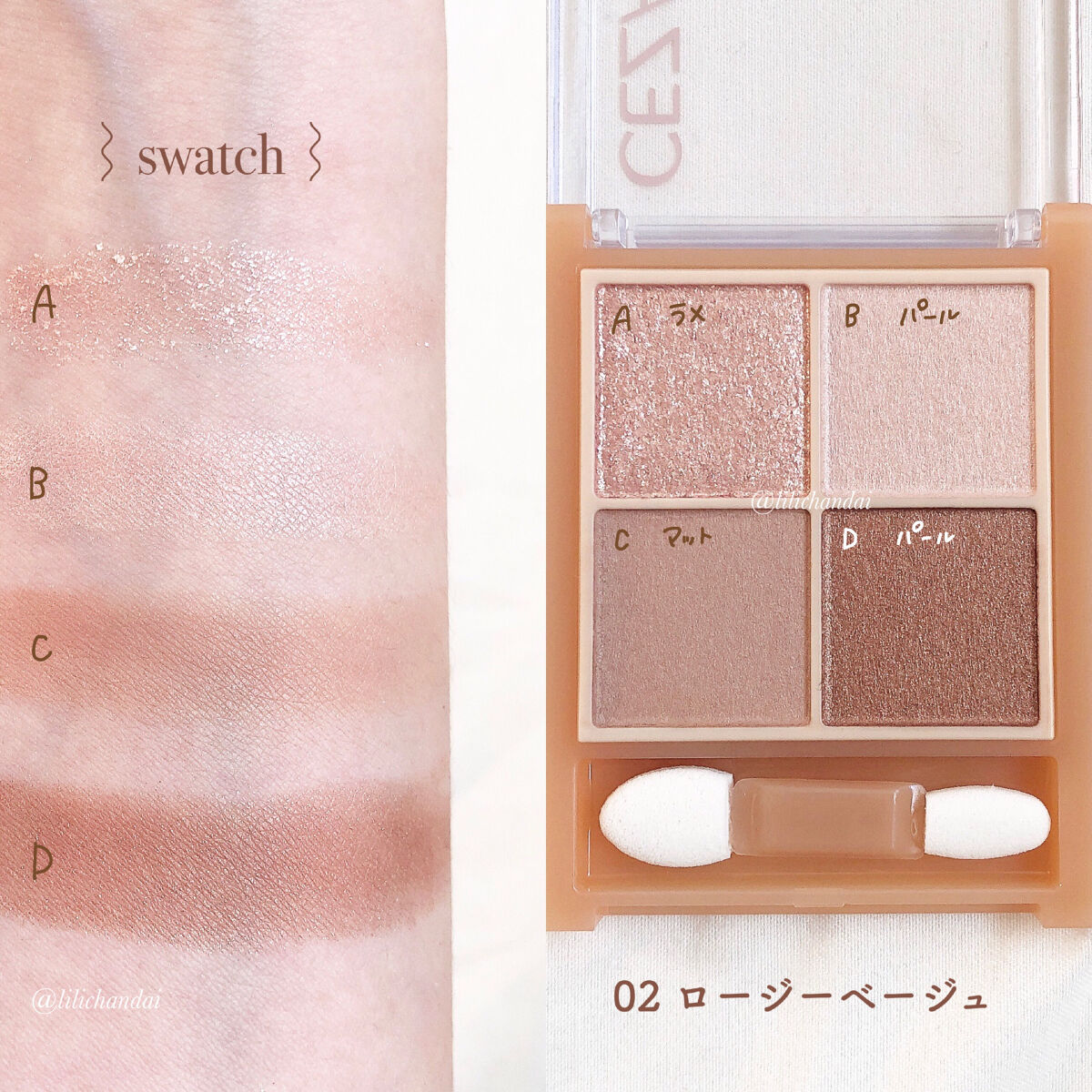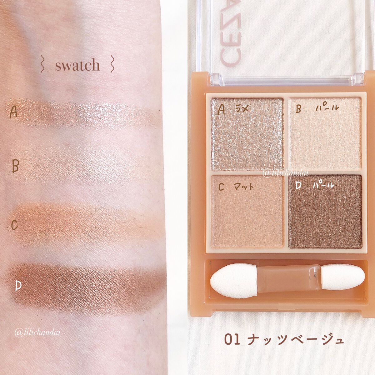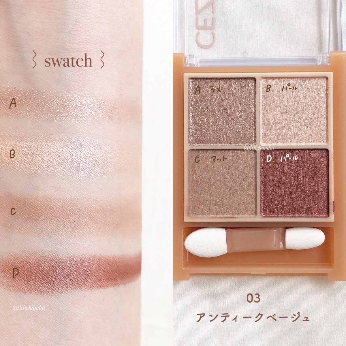 - ラメ・パール・マット3質感の4色アイシャドウ。 肌馴染みの良いベージュを基調としたカラー。ラメ・パール・マットの3質感を重ねて、自然にまぶたを強調し奥行のある大きな目元へ。 しっとり溶け込むような柔らかなパウダーなので、スルスル伸びてまぶたにピタッと密着。保湿成分(スクワラン・ホホバ種子油)配合。