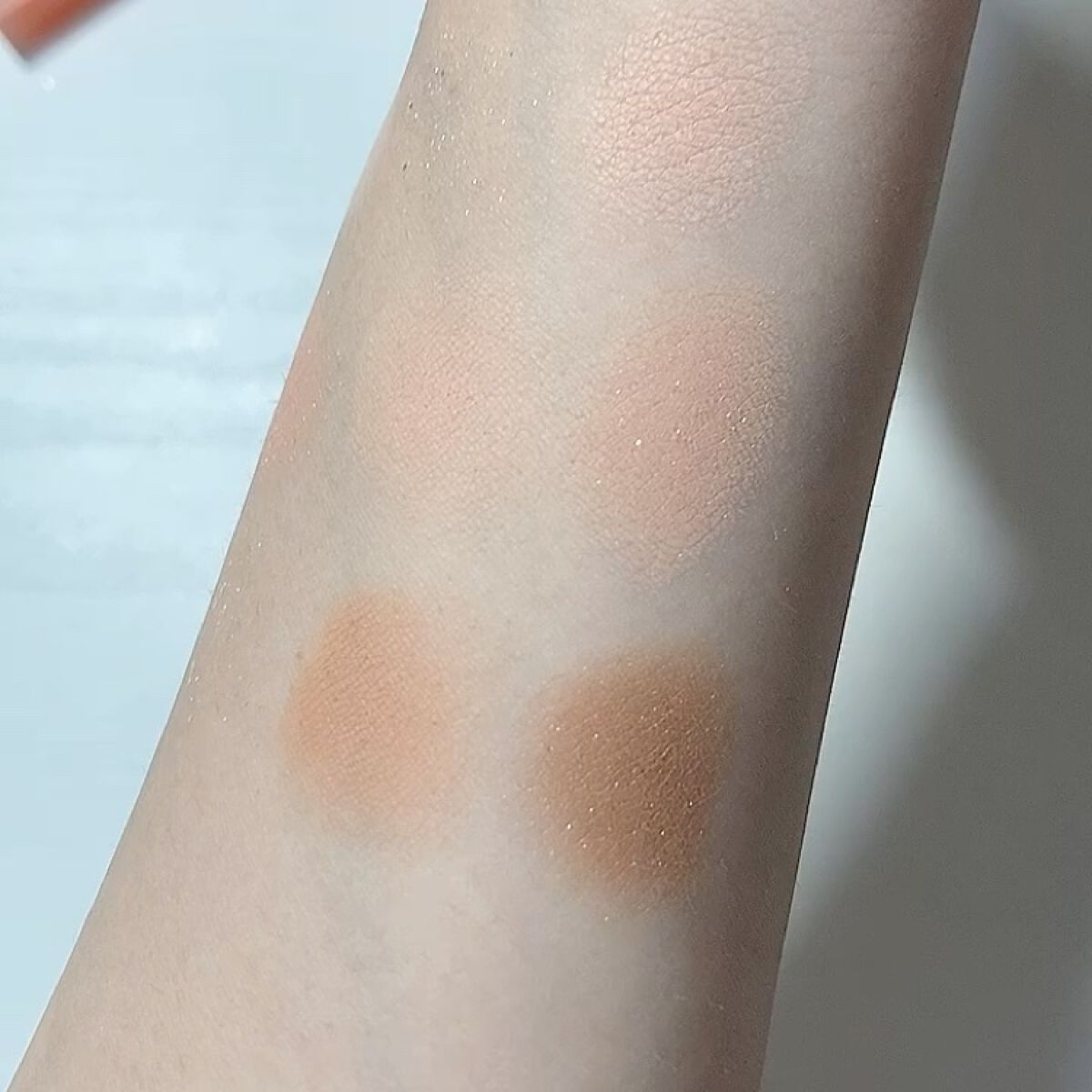 アイシャドウパレットは淡いオレンジで イエベの方はもちろん、ブルベの方でも 挑戦できそうだと思いました! 発色は柔らかくブラシで乗せると より淡くなります🫧 大粒のラメも入っているので いろんなメイクが楽しめます♡ チークも4色絶妙に違って グラデーションも作りやすいです!!