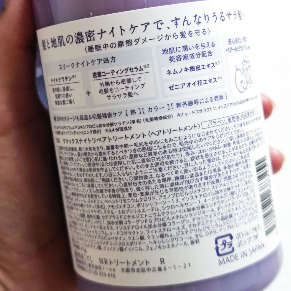 - 睡眠中の摩擦ダメージから髪を守る。髪と地肌の濃密ナイトケアで、すんなりうるサラ髪へ。安らぎたい夜に、ペアー&ゼラニウムの香り。
