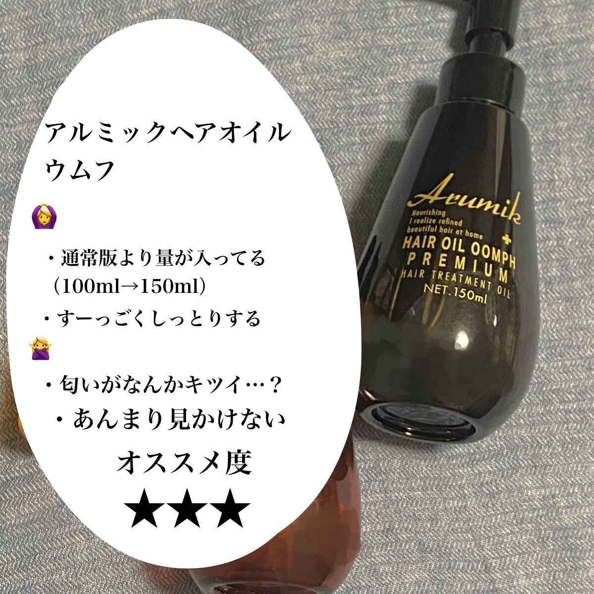 ミジャンセンのヘアオイルはしまむらで購入 800円くらいでした! アルミックヘアオイル2つはドンキで購入 500円くらいで変えたと思います! アルミックヘアオイルは家族使いしていて 5本以上リピートしてます笑 オススメ度を星2にしてますがアルミックヘアオイルを最初に使ってもらってから保湿感が足りなければアムウ(黒い方)を検討するのが1番いいかと思います!!