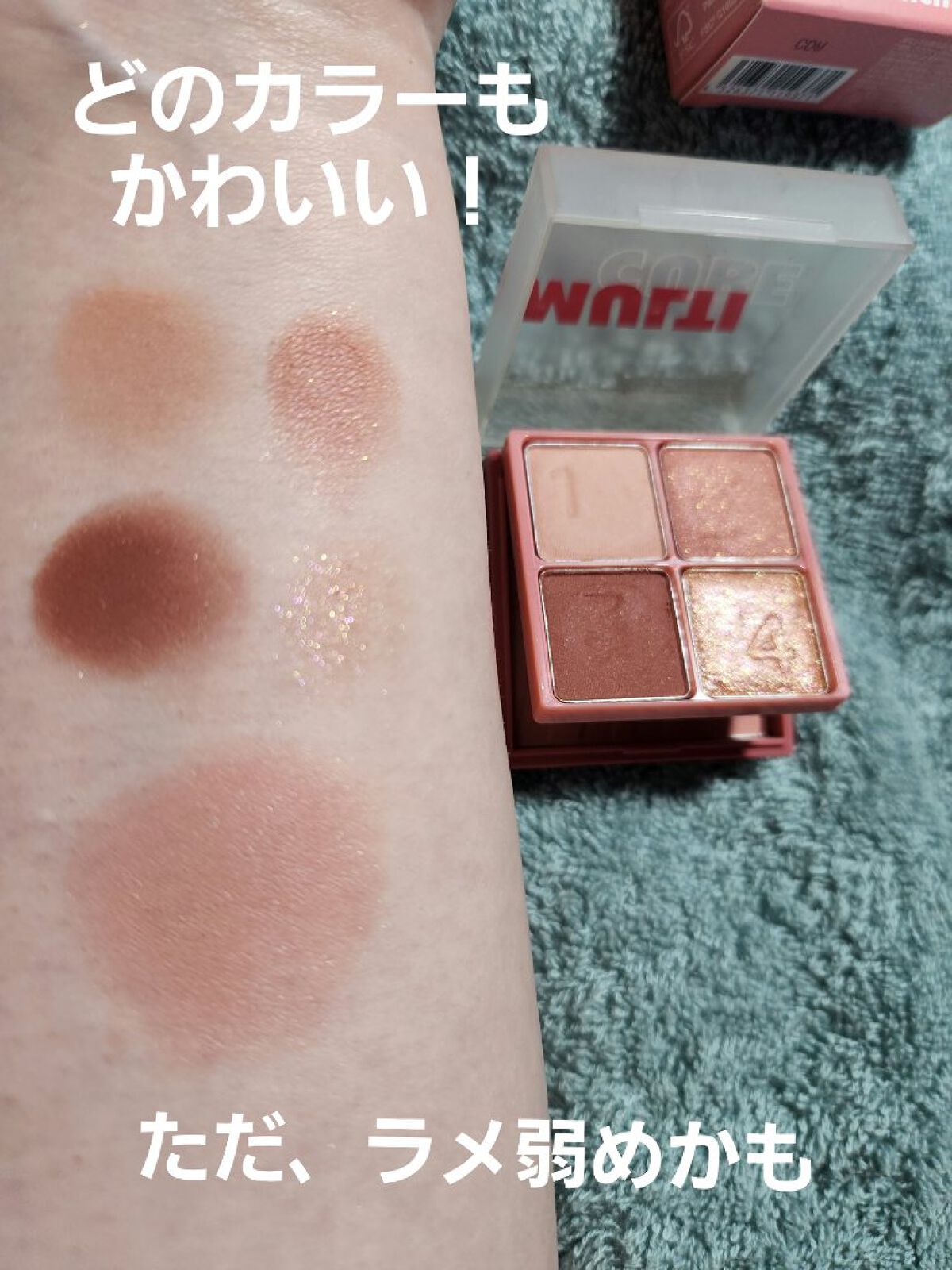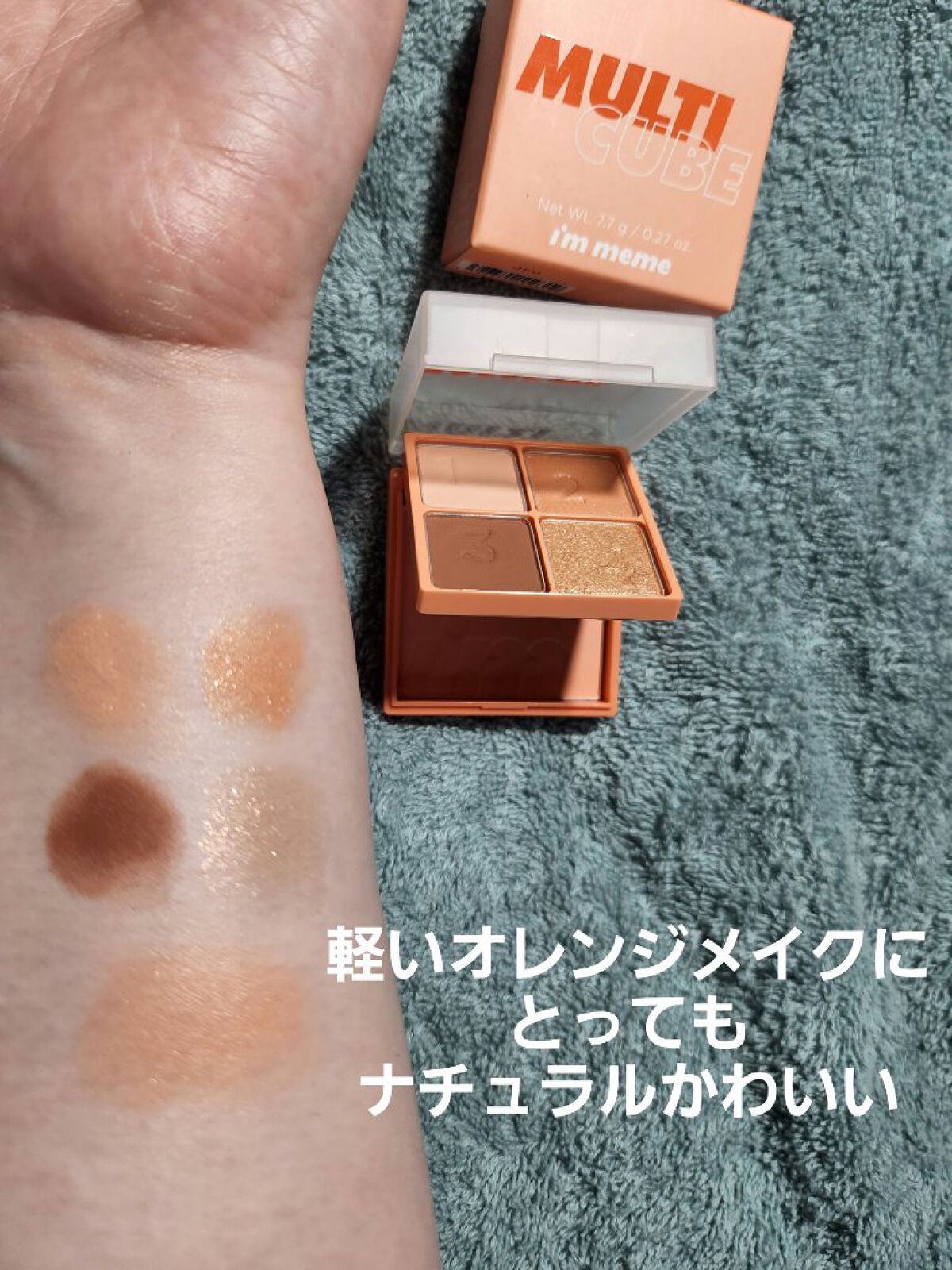 I'MMEMEアイムミミマルチキューブピンク系≫04GlamRoseオレンジ系≫02HelloPeachアイシャドウもチークもこれ1つ❤️どちらもラメ弱めで、私は少し物足りなかった💦カラーはかわいい✨💗他のカラーも少しラメもキラキラしてて、肌...