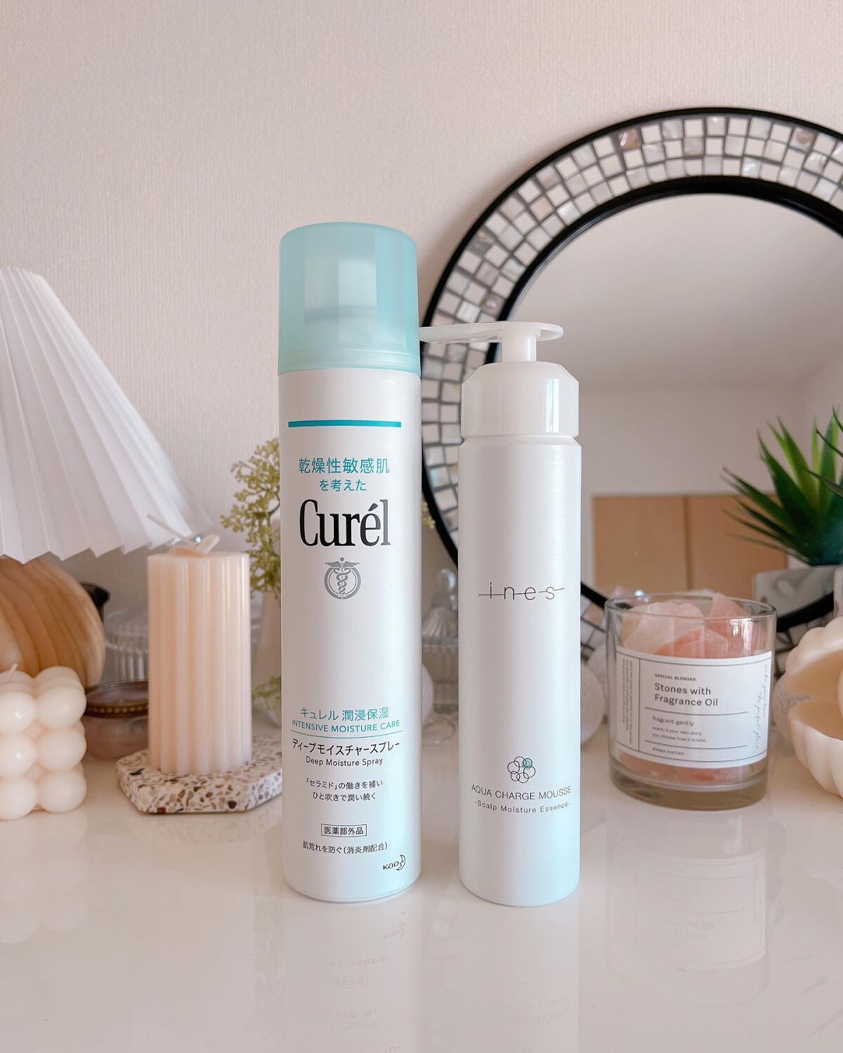 キュレル ディープモイスチャースプレー1日中使える顔・からだ用のミスト状化粧水。お風呂上がり、メイクの上から、デリケートなお子さまの肌にも。やさしい噴射のスプレーでしっとりした使い心地です ( ˃ ᵕ ˂ ) ines アクアチャージムース(スカルプ保湿美容液)8月10日に発売したばかり❤︎「炭酸泡の美容ムース」の頭皮用保湿美容液。洗髪しタオルドライした後に、濡れた髪に使います。もっちりした泡で清涼感があるよ.ᐟ.ᐟ