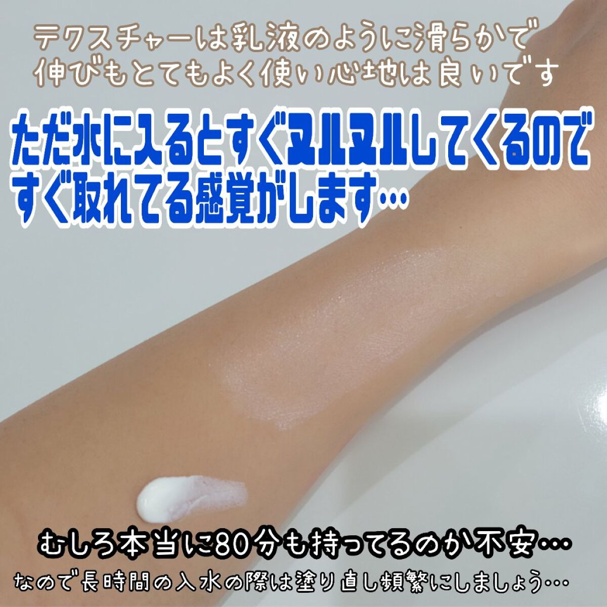 プールはどうにもならないですよね(焼けることが前提の場所なので😱)でもアリィーの日焼け止めはウォータープルーフ機能が80分も保ってくれるのは日焼け止めとしてすごいです👍