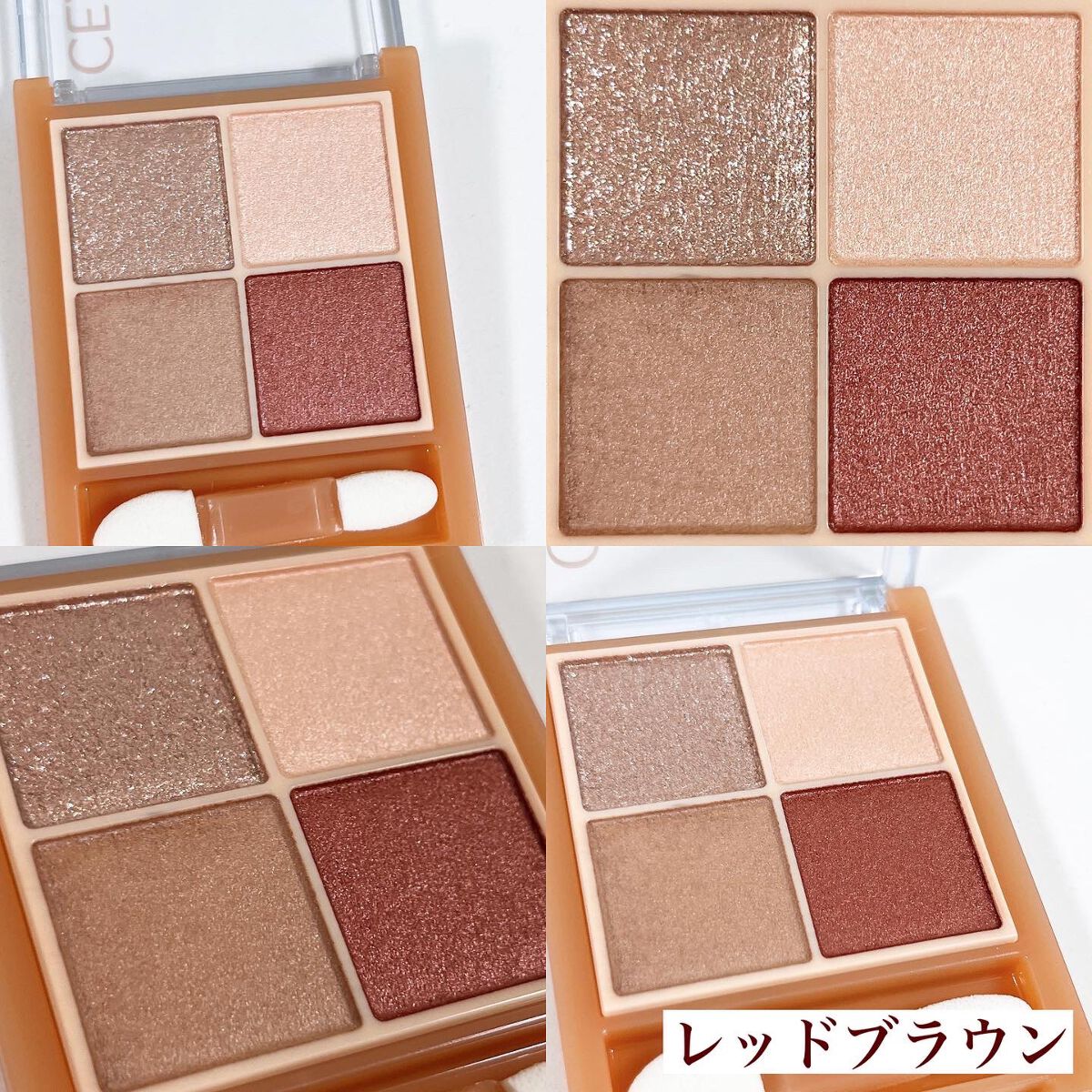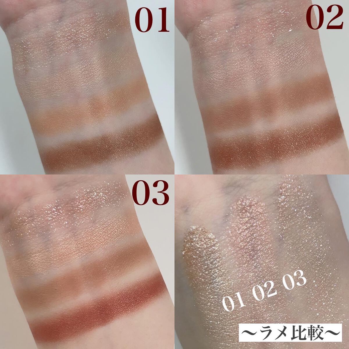 - ラメ・パール・マット3質感の4色アイシャドウ。 肌馴染みの良いベージュを基調としたカラー。ラメ・パール・マットの3質感を重ねて、自然にまぶたを強調し奥行のある大きな目元へ。 しっとり溶け込むような柔らかなパウダーなので、スルスル伸びてまぶたにピタッと密着。保湿成分(スクワラン・ホホバ種子油)配合。