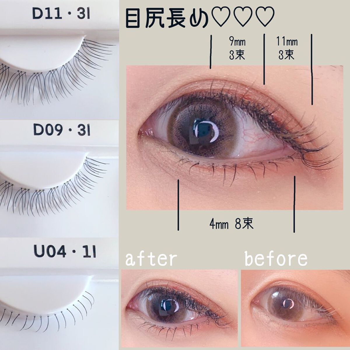 目尻に7.3N(7mm)と9.5N(9mm)をつけてボリュームのあるまつ毛になったから、いつもよりぱっちり目にみえるよ✨ ブラウンのマスカラとも馴染んでブラックとのmixカラーに♡可愛いです¨̮ つけまは短めにはさみで切ってつけたい所につけたよ☺️