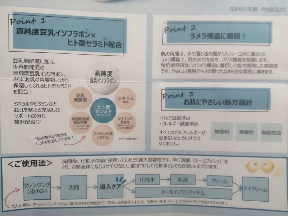 - 「なめらか本舗」から、世界新開発※1の成分「高純度豆乳イソフラボン※2」を配合した、肌を整える導入美容液が新登場!肌メンテで"目指せ、ゆらがない肌!" さらっとしながらも、絶妙なとろみのあるテクスチャーが気持ちよく肌に浸透※3します。 洗顔の後、化粧水の前に使用していただく導入美容液です。手に適量(1~2プッシュ)をとり、お顔全体になじませてください。重ねづけして化粧水としてもお使いいただけます。 【おすすめポイント】 1.豆乳発酵液※2に加え、高純度豆乳イソフラボン※2と、ヒト型セラミド※2も配合!ミネラル※2やビタミン※2などのサポート成分も贅沢配合🎵 2.ラメラ構造に着目して処方開発!キメの整ったなめらかな素肌に導きます。 3.お肌のことを考えた処方設計(無香料・無着色・無鉱物油) ※1 化粧品原料として世界で初めてINCI名(国際化粧品表示名称)を取得しました ※2 保湿成分 ※3 角層まで