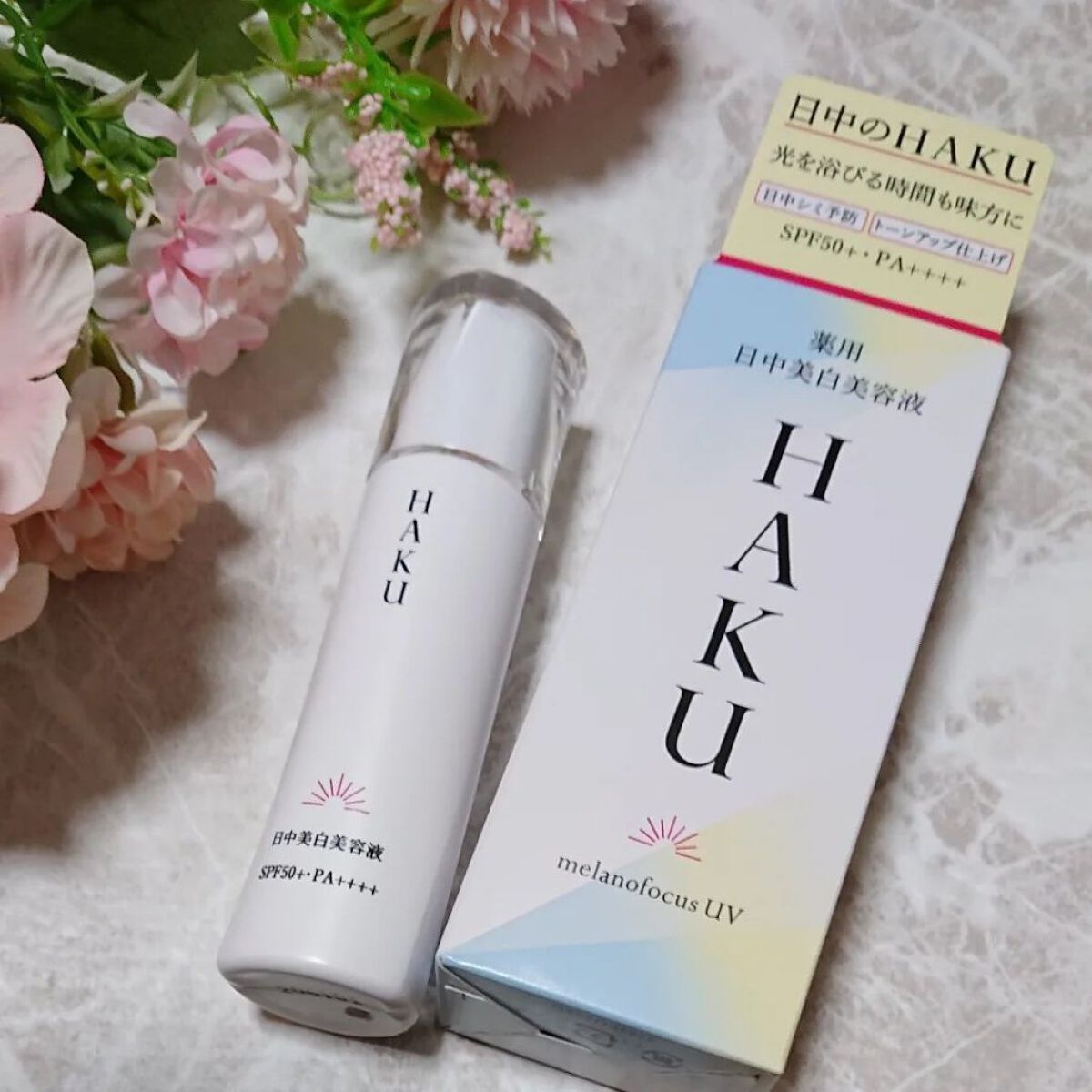 - 販売名「メラノフォーカスUV」 SPF50+・PA++++ 日中のHAKU。光を浴びる時間も味方に、日中だからできる美白ケアのアプローチ。 シミ予防研究の先端技術を搭載し、日中ならではの美白ケアを可能にした、薬用日中美白美容液です。光を浴びる時間も味方にして、明るく透明感のある肌に導きます。 ○2種の美白有効成分を肌の奥まで届け効かせる。 ○日中の肌環境に着目し、Wデイエフェクターを配合。うるおいを与え届ける。 〇ファインレッドパールαが効果的に光を放ち、シミや色ムラを目立たせない。トーンアップ効果で、明るく透明感のある仕上がり。 〇みずみずしい美容液がスーッとなじむ。化粧下地としても使える。 ○無香料・アレルギーテスト済み・ニキビのもとになりにくい処方。 (全てのかたにアレルギーが起きない、ニキビができないというわけではありません)。