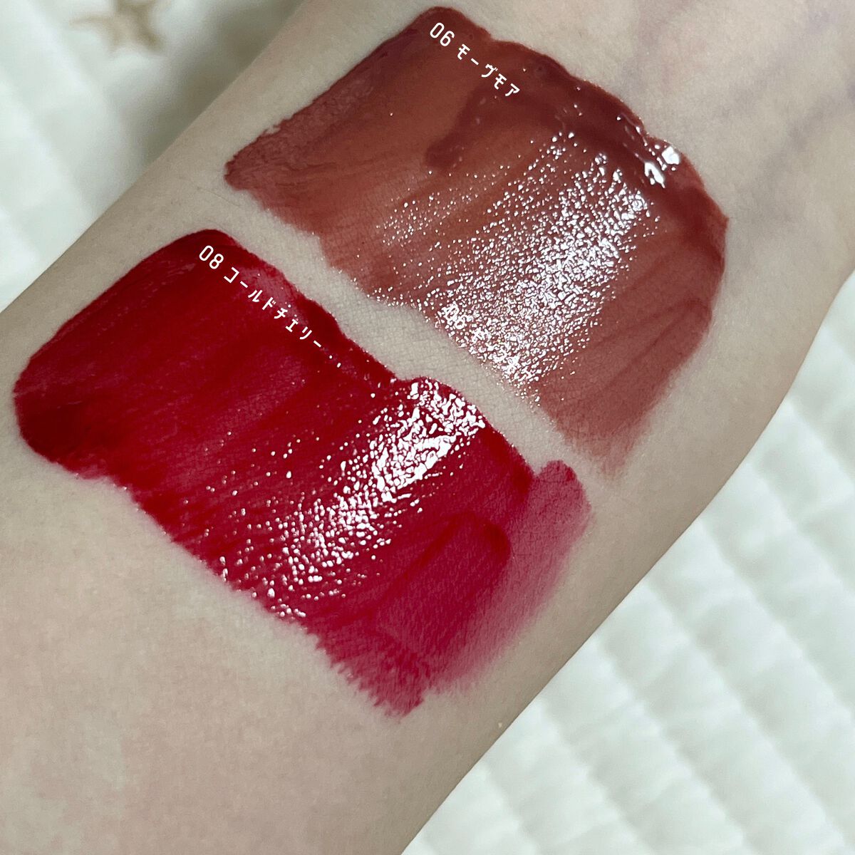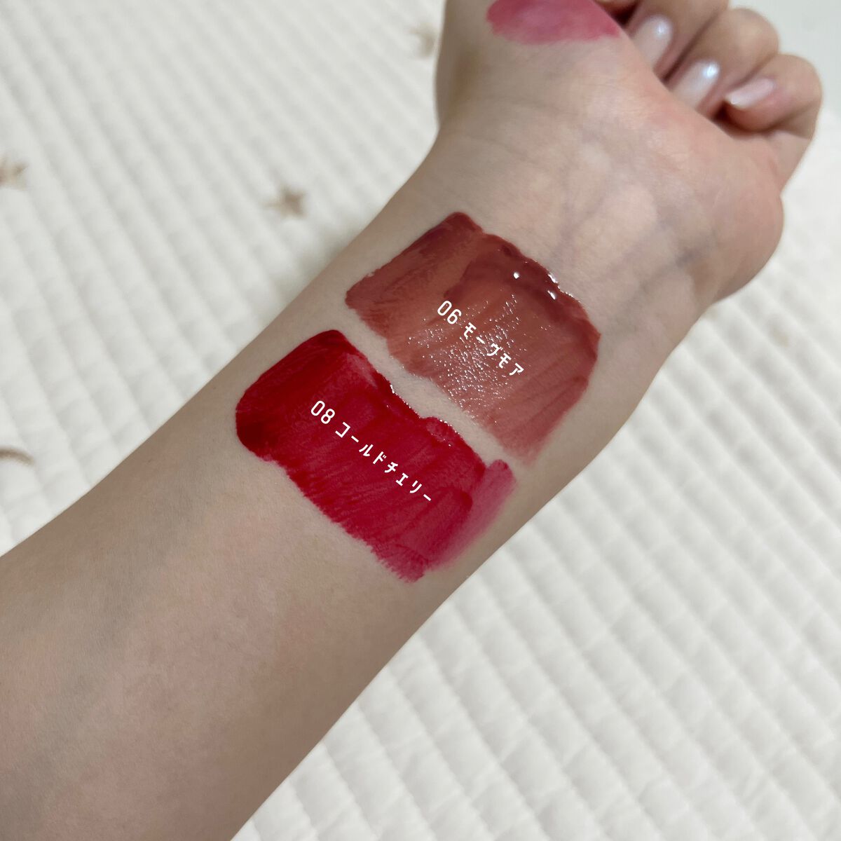 - <01 オウンピンク> ジフェニルジメチコン、水、リンゴ酸ジイソステアリル、ビスジグリセリルポリアシルアジペート-2、オクチルドデカノール 水添ポリイソブテン、セチルPEG/PPG-10/1ジメチコン、BG、イソステアリン酸ソルビタン、ポリソルベート60 ペンチレングリコール、(アクリル酸ヒドロキシエチル/アクリロイルジメチルタウリンNa)コポリマー セテアレス-20、酸化チタン、スクワラン、フェノキシエタノール、ステビオシド、赤色227号、黄色4号、香料、オクトキシグリ セリン、赤色104号の(1)、青色1号 <02 コーラルグラッセ> ジフェニルジメチコン、水、リンゴ酸ジイソステアリル、ビスジグリセリルポリアシルアジペート-2、オクチルドデカノール、水添ポリイソブテン、ダイマージリノール酸ダイマージリノレイルビス (ベヘニル/イソステアリル/フィトステリル)、グ リセリン、セチルPEG/PPG-10/1ジメチコン、BG、イソステアリン酸ソルビタン、ポリソルベート60、ペンチレング リコール、(アクリル酸ヒドロキシエチル/アクリロイルジメチルタウリンNa)コポリマー、セテアレス-20、スクワラン、酸 化チタン、フェノキシエタノール、ステビオシド、赤色227号、黄色4号、香料、オクトキシグリセリン、黄色5号 <03 ウィークエンド> ジフェニルジメチコン、水、リンゴ酸ジイソステアリル、ビスジグリセリルポリアシルアジペート-2、オクチルドデカノール、水添ポリイソブテン、ダイマージリノール酸ダイマージリノレイルビス(ベヘニル/イソステアリル/フィトステリル)、グリ セリン、セチルPEG/PPG-10/1ジメチコン、BG、イソステアリン酸ソルビタン、ポリソルベート60,ペンチレングリ コール、(アクリル酸ヒドロキシエチル/アクリロイルジメチルタウリンNa)コポリマー、セテアレス-20、スクワラン、フェ ノキシエタノール、黄色5号、ステビオシド、赤色227号,香料、オクトキシグリセリン、赤色104号の (1) <04 バーントチリ> ジフェニルジメチコン、水、リンゴ酸ジイソステアリル、ビスジグリセリルポリアシルアジペート-2、オクチルドデカノール、水添ポリイソブテン、ダイマージリノール酸ダイマージリノレイルビス (ベヘニル/イソステアリル/フィトステリル)、グリセリン、BG、セチルPEG/PPG-10/1ジメチコン、イソステアリン酸ソルビタン、ポリソルベート60、ペンチレング リコール、(アクリル酸ヒドロキシエチル/アクリロイルジメチルタウリンNa)コポリマー、セテアレス-20、スクワラン、フフェノキシエタノール、赤色227号、黄色4号、ステビオシド、C177491、香料、オクトキシグリセリン、青色1号、ポリアクリル酸 アンモニウム <05 ウィンディ> ジフェニルジメチコン、水、リンゴ酸ジイソステアリル、ビスジグリセリルポリアシルアジペート-2、オクチルドデカノール 水添ポリイソブテン、ダイマージリノール酸ダイマージリノレイルビス(ベヘニル/イソステアリル/フィトステリル)、グ リセリン、BG、セチルPEG/PPG-10/1ジメチコン、イソステアリン酸ソルビタン、ポリソルベート60、ペンチレング リコール、(アクリル酸ヒドロキシエチル/アクリロイルジメチルタウリンNa)コポリマー、セテアレス-20,酸化チタン、スクワラン、フェノキシエタノール、ステビオシド、赤色227号、黄色5号,香料、オクトキシグリセリン、赤色104号の (1)、水酸 化Al、ポリアクリル酸アンモニウム、黄色4号 <06 モーヴモア> ジフェニルジメチコン、水、リンゴ酸ジイソステアリル、ビスジグリセリルポリアシルアジペート-2、オクチルドデカノール,グリセリン、水添ポリイソブテン、ダイマージリノール酸ダイマージリノレイルビス (ベヘニル/イソステアリル/フィトステリル)、セ チルPEG/PPG-10/1ジメチコン、BG、イソステアリン酸ソルビタン、ポリソルベート60,ペンチレングリコール、酸化チタン、(アクリル酸ヒドロキシエチル/アクリロイルジメチルタウリンNa)コポリマー、セテアレス-20、スクワラン、フェノキシエ タノール、ステビオシド、黄色4号、赤色227号、香料、オクトキシグリセリン、赤色104号の(1)、黄色5号、青色1号 <07 プラミー> ジフェニルジメチコン、水、リンゴ酸ジイソステアリル、ビスジグリセリルポリアシルアジペート-2、オクチルドデカノール、水添ポリイソブテン、ダイマージリノール酸ダイマージリノレイルビス(ベヘニル/イソステアリル/フィトステリル)、グリセリン、セチルPEG/PPG-10/1ジメチコン、BG、イソステアリン酸ソルビタン、ポリソルベート60,ペンチレングリコール、(アクリル酸ヒドロキシエチル/アクリロイルジメチルタウリンNa)コポリマー、セテアレス-20,スクワラン、フ フェノキシエタノール、赤色104号の(1)、赤色227号、ステビオシド、黄色5号,香料、オクトキシグリセリン、青色1号 <08 コールドチェリ> ジフェニルジメチコン、水、リンゴ酸ジイソステアリル、ビスジグリセリルポリアシルアジペート-2、オクチルドデカノール 水添ポリイソブテン、ダイマージリノール酸ダイマージリノレイルビス (ベヘニル/イソス