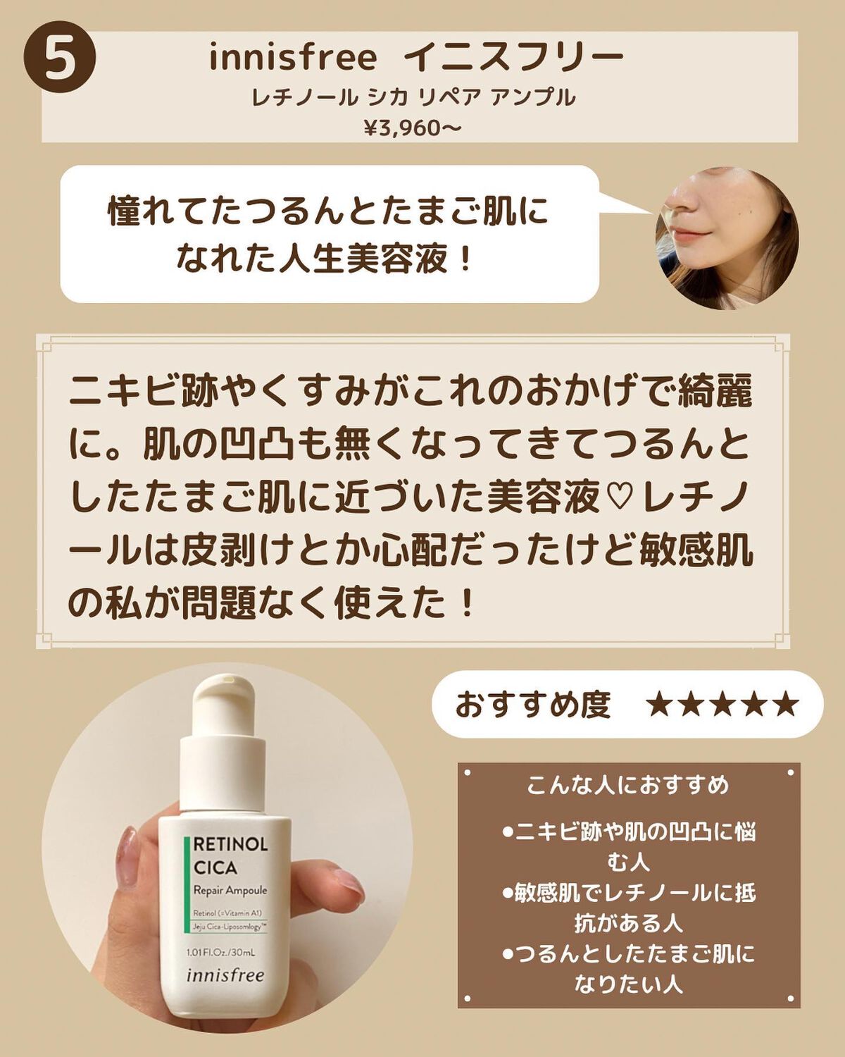 私は全然消えないニキビ跡にすごい悩まされていました🥲 紹介した中でもイニスフリーのレチノールシカは1番効果を感じました! 他の美容液ももちろん効果を感じたものなのでぜひ試して欲しいです✌🏻