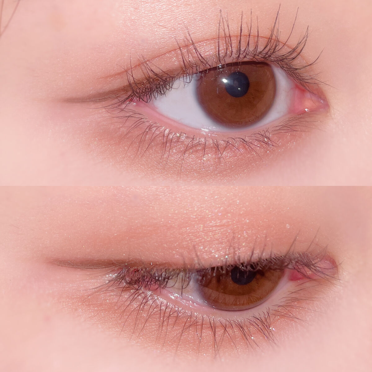 水色ラメとブラウンの不思議な組み合わせ でも可愛い! 他の色より芯が硬めで、発色させようとしてゴリゴリ描いてしまう…瞼に負担かかってそう💦 この色のシャドウの時に、儚い感をプラスするためにまつ毛も薄めの色にしてみてるどうかな…