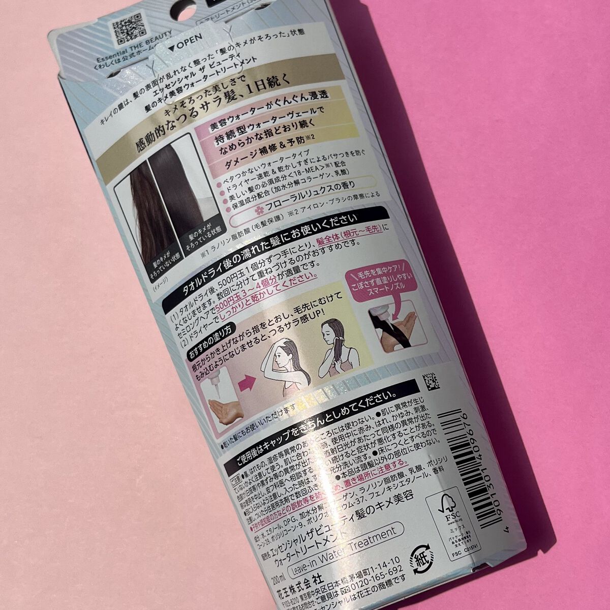 エッセンシャルザビューティ髪のキメ美容ウォータートリートメントホワイトティーの香りの感想です。洗い流さないウォータートリートメント持続型ウォーターベールでなめらかな指通りへ【使用感】・ホワイトティーの香りがめっちゃいい・ドライヤー速乾はイマイ...