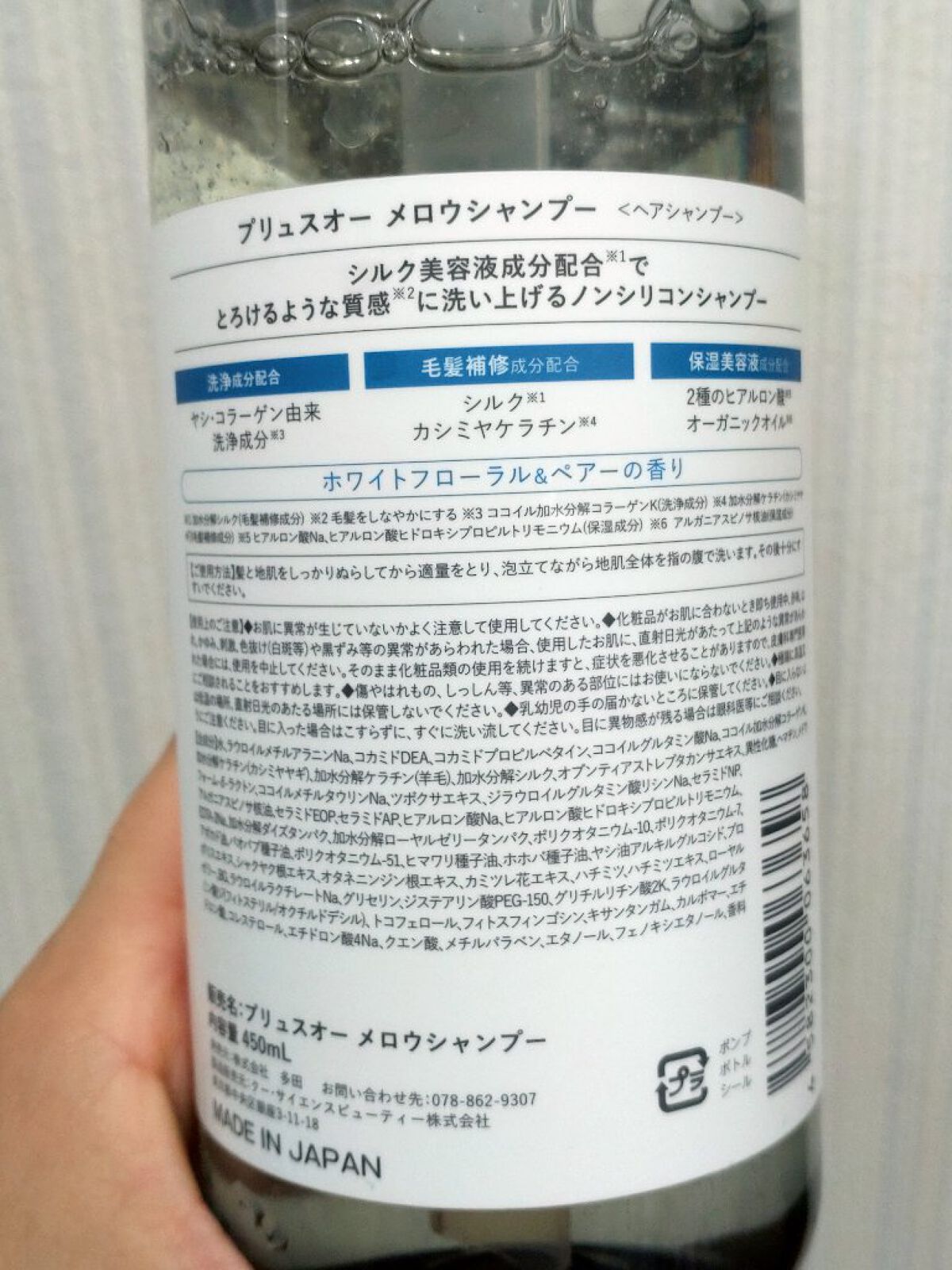 - <シャンプー 450ml> 水、ラウロイルメチルアラニンNa、コカミドDEA、コカミドプロピルベタイン、ココイルグルタミン酸Na、ココイル加水分解コラーゲンK、加水分解ケラチン(カシミヤヤギ)、加水分解ケラチン(羊毛)、加水分解シルク、オプンティアストレプタカンサエキス、異性化糖、ヘマチン、メドウフォーム-δ-ラクトン、ココイルメチルタウリンNa、ツボクサエキス、ジラウロイルグルタミン酸リシンNa、セラミドNP、アルガニアスピノサ核油、セラミドEOP、セラミドAP、ヒアルロン酸Na、ヒアルロン酸ヒドロキシプロピルトリモニウム、EDTA-2Na、加水分解ダイズタンパク、加水分解ローヤルゼリータンパク、ポリクオタニウム-10、ポリクオタニウム-7、アボカド油、バオバブ種子油、ポリクオタニウム-51、ヒマワリ種子油、ホホバ種子油、ヤシ油アルキルグルコシド、プロポリスエキス、シャクヤク根エキス、オタネニンジン根エキス、カミツレ花エキス、ハチミツ、ハチミツエキス、ローヤルゼリー、BG、ラウロイルラクチレートNa、グリセリン、ジステアリン酸PEG-150、グリチルリチン酸2K、ラウロイルグルタミン酸ジ(フィトステリル/オクチルドデシル)、トコフェロール、フィトスフィンゴシン、キサンタンガム、カルボマー、エチドロン酸、コレステロール、エチドロン酸4Na、クエン酸、メチルパラベン、エタノール、フェノキシエタノール、香料 <トリートメント 450ml> 水、ステアリルアルコール、グリセリン、ハチミツ、ベヘントリモニウムクロリド、ジメチコン、加水分解ケラチン(カシミヤヤギ)、加水分解シルク、加水分解コラーゲン、水溶性コラーゲン、サクシノイルアテロコラーゲン、加水分解ケラチン(羊毛)、加水分解ケラチン、アルガニアスピノサ核油、ツバキ種子油、ホホバ種子油、セラミドNP、アボカド油、バオバブ種子油、ヒマワリ種子油、メドウフォーム-δ-ラクトン、プルケネチアボルビリス種子油、ポリクオタニウム-51、ポリクオタニウム-64、加水分解ローヤルゼリータンパク、ヒアルロン酸Na、ヒアルロン酸ヒドロキシプロピルトリモニウム、ジラウロイルグルタミン酸リシンNa、メドウフォーム油、セラミドAP、セラミドEOP、ポリクオタニウム-10、ヨモギ葉エキス、モモ葉エキス、アマモエキス、レモン果実エキス、グレープフルーツ果実エキス、ミツイシコンプエキス、ゴボウ根エキス、コーヒー種子エキス、アプンティアストレプタカンサエキス、豆乳発酵液、グレープフルーツ果皮油、ゴマ油、シア脂、加水分解ダイズタンパク、BG、黒砂糖、ステアリン酸PEG-55、シクロベンタシロキサン、アルギニン、グルタミン酸、ステアルトリモニウムクロリド、グリチルリチン酸2K、グルコシルルチン、ラウロイウグルタミン酸ジ(フィトステリル/オクチルドデシル)、ラウロイルラクチレートNa、ベンチレングリコール、ヘマチン、ユビキノン、水添レシチン、トコフェロール、フィトスフィンゴシン、コレステロール、キサンタンガム、カルポマー、腐植土抽出物、イソプロパノール、ヒドロキシエチルセルロース、ジココジモニウムクロリド、フェノキシエタノール、アモジメチコン、アミノプロピルジメチコン、エタノール、香料 <シャンプー詰替用 350ml> 水、ラウロイルメチルアラニンNa、コカミドDEA、コカミドプロピルベタイン、ココイルグルタミン酸Na、加水分解ケラチン(カシミヤヤギ)、加水分解ケラチン(羊毛)、加水分解シルク、ココイル加水分解コラーゲンK、オプンティアストレプタカンサエキス、異性化糖、ヘマチン、メドウフォーム-δ-ラクトン、ココイルメチルタウリンNa、ツボクサエキス、ジラウロイルグルタミン酸リシンNa、セラミドNP、アルガニアスピノサ核油、セラミドEOP、セラミドAP、ヒアルロン酸Na、ヒアルロン酸ヒドロキシプロピルトリモニウム、EDTA-2Na、加水分解ダイズタンパク、加水分解ローヤルゼリータンパク、ポリクオタニウム-10、ポリクオタニウム-7、アボカド油、バオバブ種子油、ポリクオタニウム-51、ヒマワリ種子油、ホホバ種子油、ヤシ油アルキルグルコシド、プロポリスエキス、シャクヤク根エキス、オタネニンジン根エキス、カミツレ花エキス、ハチミツ、ハチミツエキス、ローヤルゼリー、BG、ラウロイウラクチレートNa、グリセリン、ジステアリン酸PEG-150、グリチルリチン酸2K、ラウロイルグルタミン酸ジ(フィトステリル/オクチルドデシル)、トコフェロール、フィトスフィンゴシン、キサンタンガム、カルポマー、エチドロン酸、コレステロール、エチドロン酸4Na、クエン酸、メチルパラベン、エタノール、フェノキシエタノール、香料 <トリートメント詰替用 350ml> 水、ステアリルアルコール、グリセリン、ハチミツ、ベヘントリモニウムクロリド、ジメチコン、加水分解シルク、加水分解ケラチン(カシミヤヤギ)、加水分解ケラチン(羊毛)、加水分解ケラチン、加水分解コラーゲン、水溶性コラーゲン、サクシノイルアテロコラーゲン、アルガニアスピノ