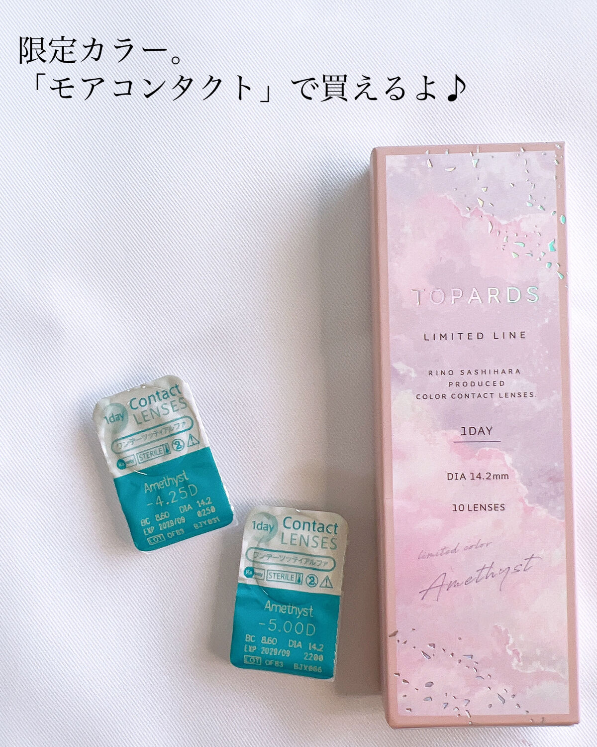 トパーズの店舗限定カラー「アメジスト」🔮🖤✴︎ 個人的に推しで大好きなカラーです🤤 宝石の「アメジスト」をそのままカラコンにしたような綺麗な透明感のあるラベンダーカラーです🤤 遠目から見ても紫ってわかる色合いながらも、透明感があるのでコスプレレンズみたいに派手にならずに使いやすいです🙌🏻