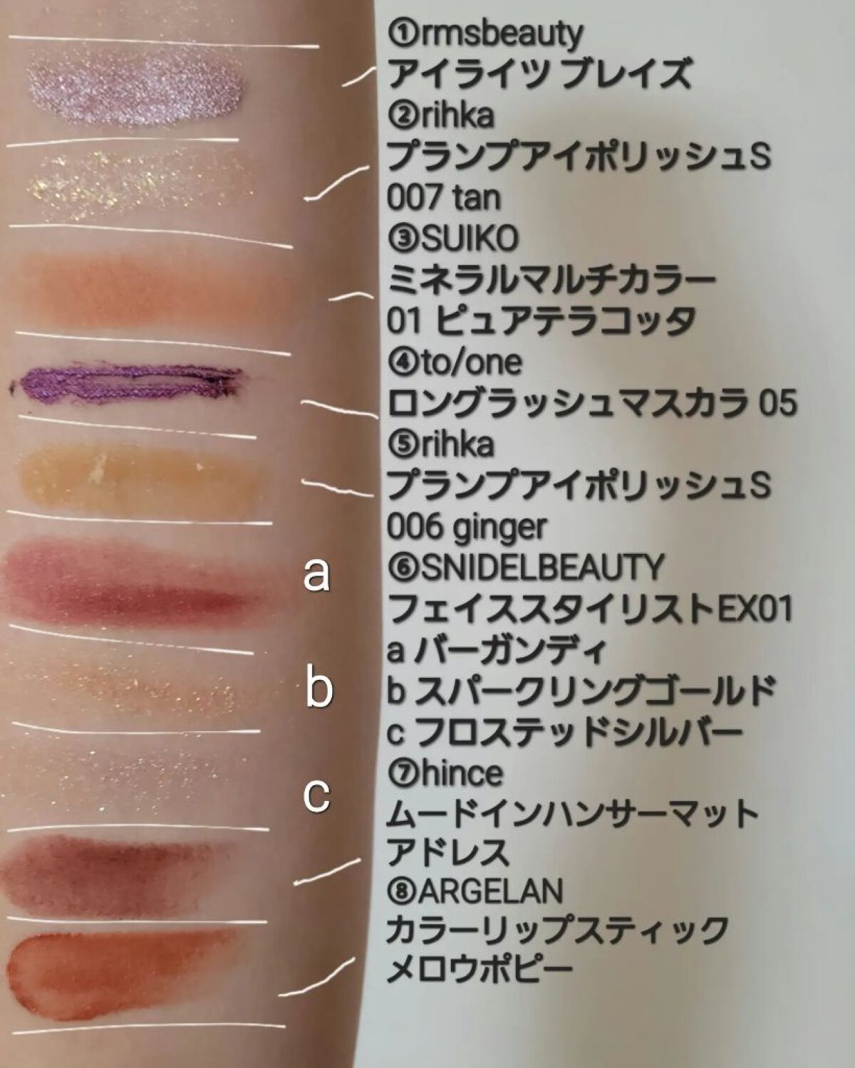 アイブロウは#whomeeのレッドブラウンを使用。 アイメイクは①#アンドビーの#クリームアイシャドウ マスタードを上下の瞼に。 アイメイクは②#misshaの#グリッタープリズムシャドウマーブル #ストームプリズムを①に重ねて。 下瞼は全体ではなく、黒目下にだけ✨ アイメイクは③#hinceの#ニューアンビエンスカラーアイライナー #エクレクティックを4枚目のように三角形に入れる。 チークは⑤#bisouの#ダイヤモンドグロウ マーズをほんのり✨ リップは⑥①のマスタードを塗った後に#celvokeの#エンスロールマットリップス 03を💋