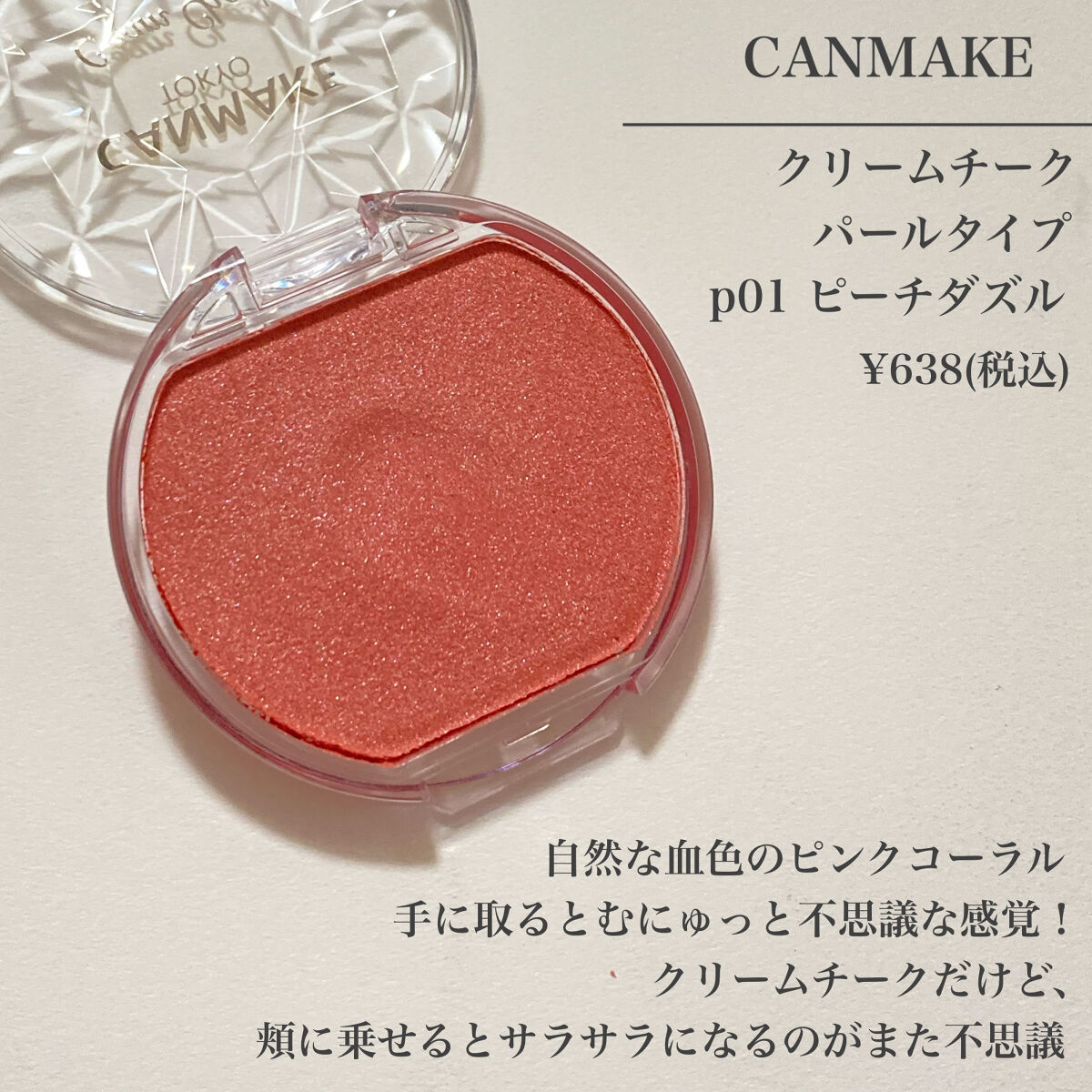 生ツヤ感爆誕 キャンメイククリームチークパールタイプP01ピーチダズル638円 むにゅっとした質感なのに指にとってみるとパウダーのようなサラサラとしたテクスチャー パール配合だからツヤ感たっぷり コンパクトで持ち運び便利