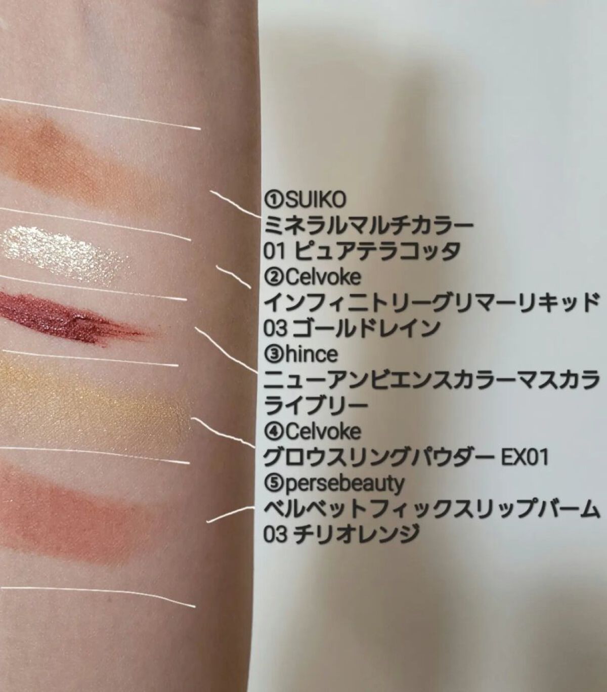 アイブロウは#whomeeのレッドブラウンを使用。 アイメイクは①#アンドビーの#クリームアイシャドウ マスタードを上下の瞼に。 アイメイクは②#misshaの#グリッタープリズムシャドウマーブル #ストームプリズムを①に重ねて。 下瞼は全体ではなく、黒目下にだけ✨ アイメイクは③#hinceの#ニューアンビエンスカラーアイライナー #エクレクティックを4枚目のように三角形に入れる。 チークは⑤#bisouの#ダイヤモンドグロウ マーズをほんのり✨ リップは⑥①のマスタードを塗った後に#celvokeの#エンスロールマットリップス 03を💋