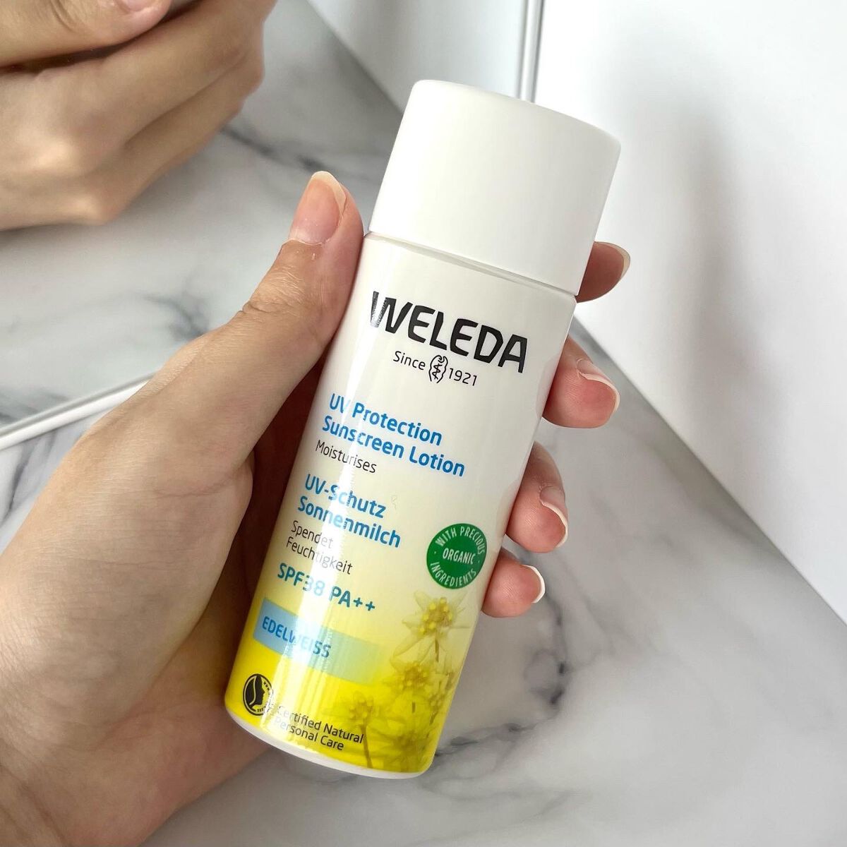 - 1年通して心地よく肌を守る、オーガニックの日焼け止め。SPF38 PA++ 紫外線から肌を守りながら、しっとりみずみずしい潤いを与えます。赤ちゃんから使えます。 ●使い方 :外出前に適量を顔・からだに均一にのばしてください。 日焼け止め効果を保つために、こまめに塗り直してください。 使用後は、洗顔料や全身用洗浄料などでよく洗ってください。 ・ベースメイクの最初の化粧下地として ・ファンデーションをお休みしたいリラックス日のメイクに ・デリケート肌に ・子どもと一緒に ●製品について :ヴェレダの日焼け止めが、内容成分も新たにリニューアルしました! 天然由来成分100%で紫外線をしっかりとカット。 植物オイルと植物エキスの保湿効果で長時間潤いが続きます。肌へのやさしい使い心地にこだわり、生後1ヶ月の赤ちゃんでも使用できます。敏感肌の方にも使いやすいアイテムです。 石けんや洗顔料、全身用洗浄料で落とすことができます。最終製品においてナノ粒子を含有していないことを測定済み。 紫外線吸収剤、合成保存料、合成香料、鉱物油不使用。 ●キープラント:エーデルワイス 標高1,500~3,400mのアルプスの高地に生息する植物。強い紫外線や風にさらされた過酷な環境でも、強く美しく咲くエーデルワイスは、肌を保湿し、引き締めます。