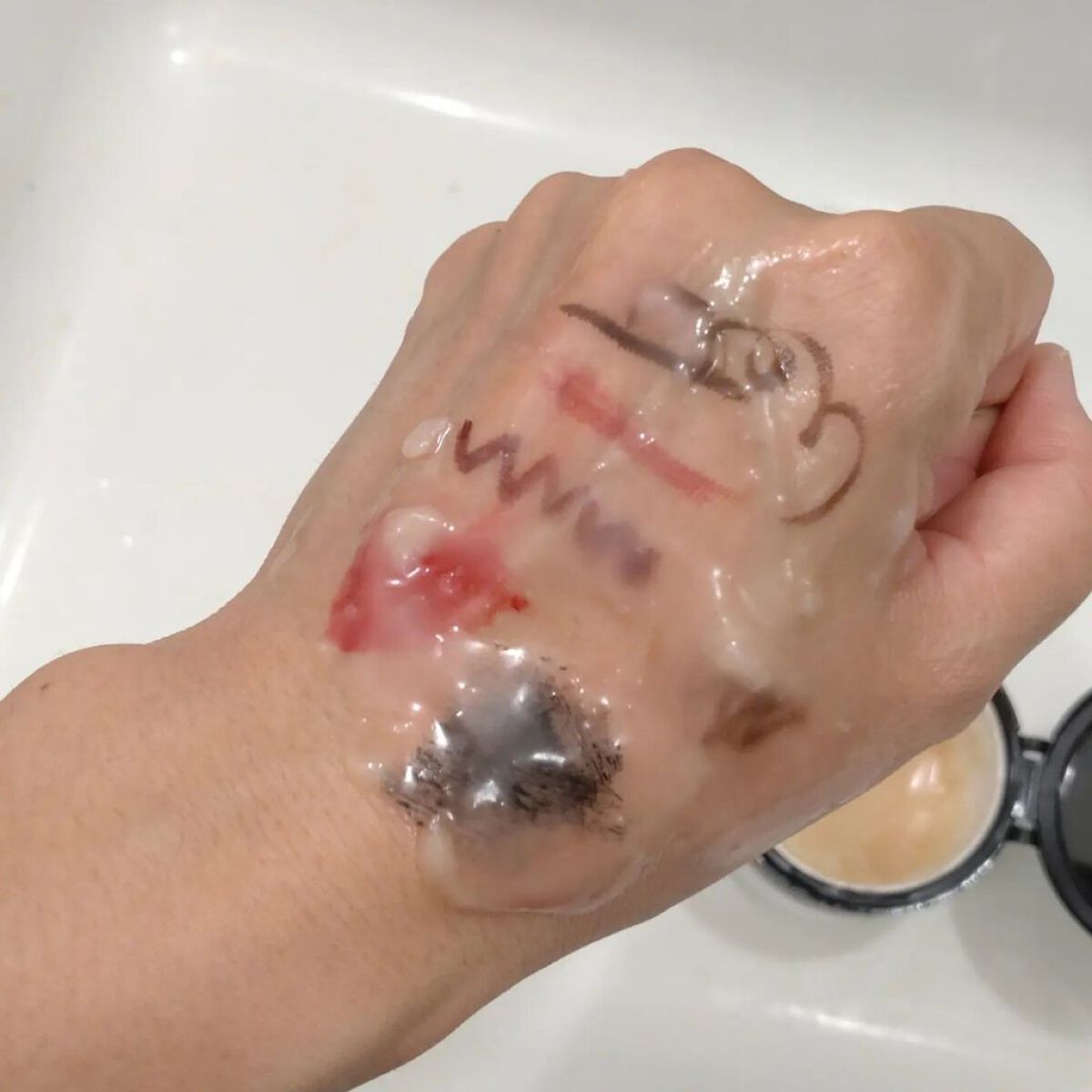 密着してふわっと発色 アイシャドウ下地としてはもちろん、チークにも◎ 03はほんのりくすみの白みピンク 瞼に使うと血色の悪さをカバーしてトーンアップしてくれるからいつもより二重の幅が強調されるように見えて良い くすみ肌の私は03をチークにしても使えた!明るめの肌やくすみのない肌の人は顔色悪く見えてしまうので注意⚠ よく伸びるので少しずつ出して使ってます 水で擦っても落ちにくかった ハンドソープでゴシゴシ洗ってやっと落ちるくらい 二重にたまらないしヨレないところも推せる 何本か買って、好みの色に混ぜても良さそう