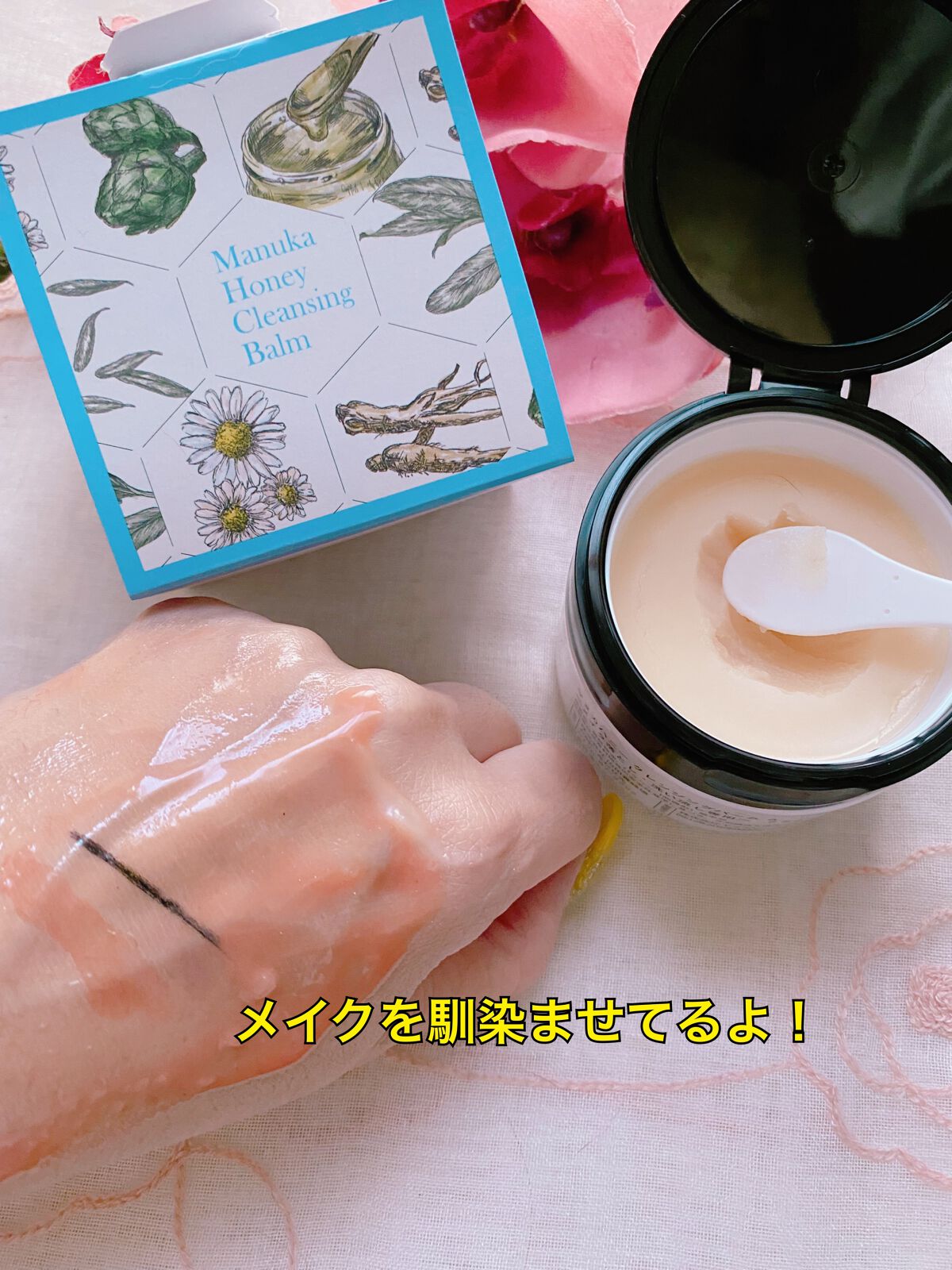 マヌカハニークレンジングバーム🍯.付属のスパチュラでバームを肌にのせて、肌温にとろりととろけるバームは、メイクの上でくるくるするとスルスルメイクと馴染む❤︎.マヌカハニーのおかげか、私は洗い上がりのしっとり感が感じられて満足🫶.抗菌成分を含む...