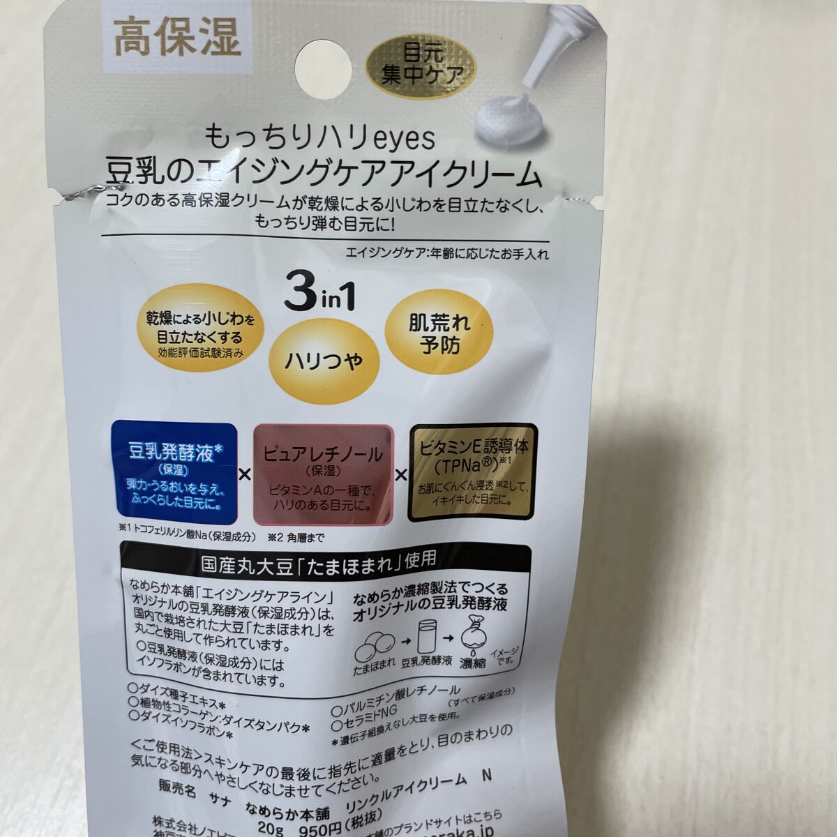 - ピュアレチノール※を新配合!濃厚アイクリームでもっちりハリeyes ※ 保湿成分 「リンクルアイクリーム N」は、『なめらか本舗』オリジナルの豆乳発酵液*1に加え、ピュアレチノール*1とビタミンE誘導体*2を新配合したもっちりとしたハリのある目元に導く「アイクリーム」です。 密着ポリマーがお肌の上で均一な膜を形成し、目元のハリ感をサポート。 毎日のスキンケアに取り入れていただくことで、年齢の出やすい目元をしっかりケアします。 〔①ピュアレチノール*1×豆乳発酵液*1×ビタミンE誘導体*2配合〕 「なめらか本舗」オリジナルのイソフラボン含有の豆乳発酵液*1に加え、ピュアレチノール*1を新配合。 さらに、ビタミンE誘導体(TPNaⓇ)*2も配合し、年齢の出やすい目元をしっかりケアします。 ・ピュアレチノール:ビタミンAの一種でハリのある目元に! ・豆乳発酵液:弾力感・うるおいを与えふっくらした目元に! ・ビタミンE誘導体(TPNaⓇ):お肌にぐんぐん浸透*3してイキイキした目元に! 〔②密着ポリマーで目元にハリ感〕 密着ポリマーがお肌の上で均一な膜を形成します。もっちりとハリのある目元に導きます。 *1 保湿成分 *2 トコフェリルリン酸Na(保湿成分) *3 角層まで