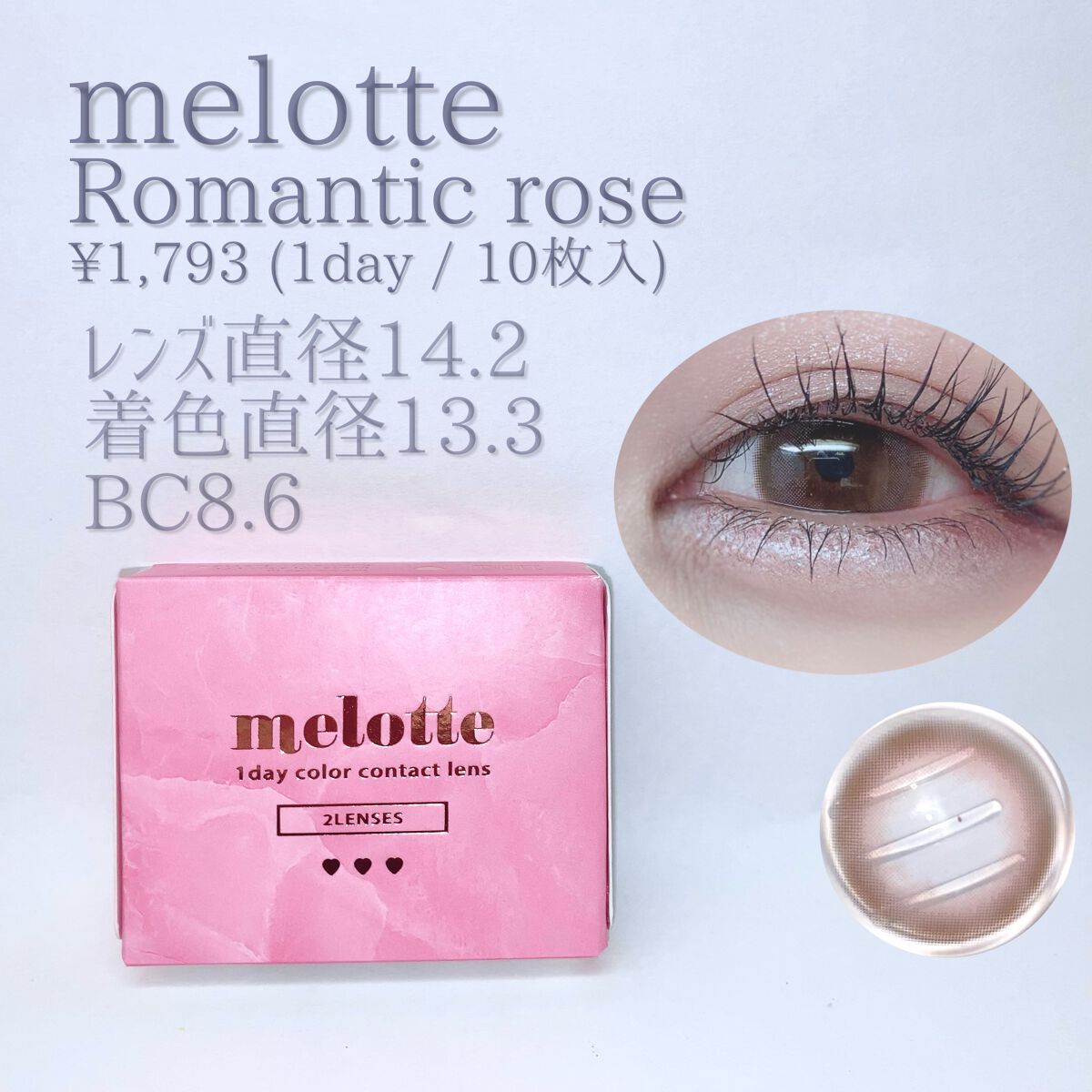 melotteメロット 1dayロマンティックローズ¥1,793DIA14.2mmBC8.6mm着色直径13.3mm含水率38%UVカット✔︎ほんのりローズの色味♡✔︎ナチュラルで使いやすいデザイン♡✔︎サイズは少し大きめだと思う。ローズの色...